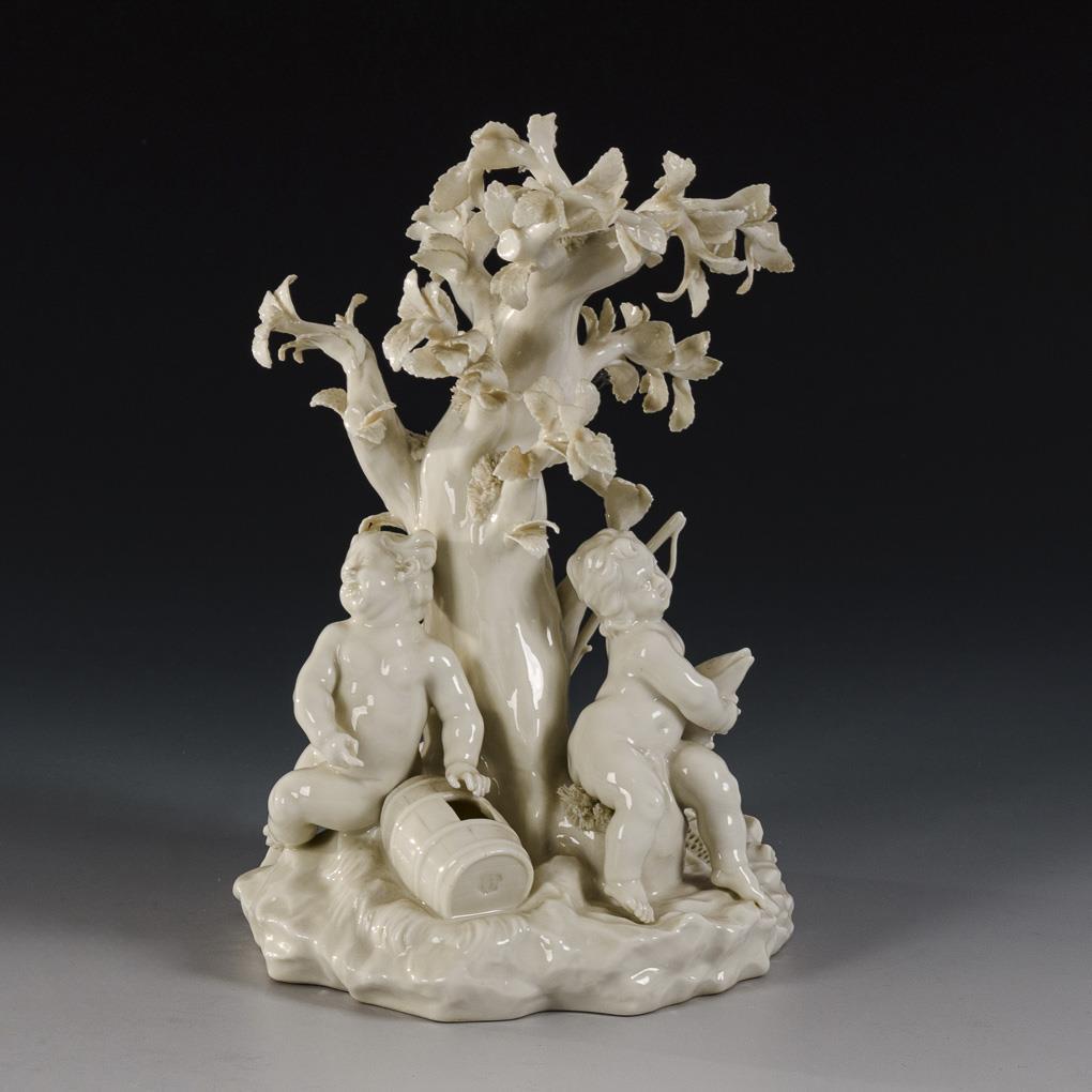 Drei unter einem Baum gruppierte Putten beim Fischfang. Angelschnur defekt, 2 Blätter bestoßen.