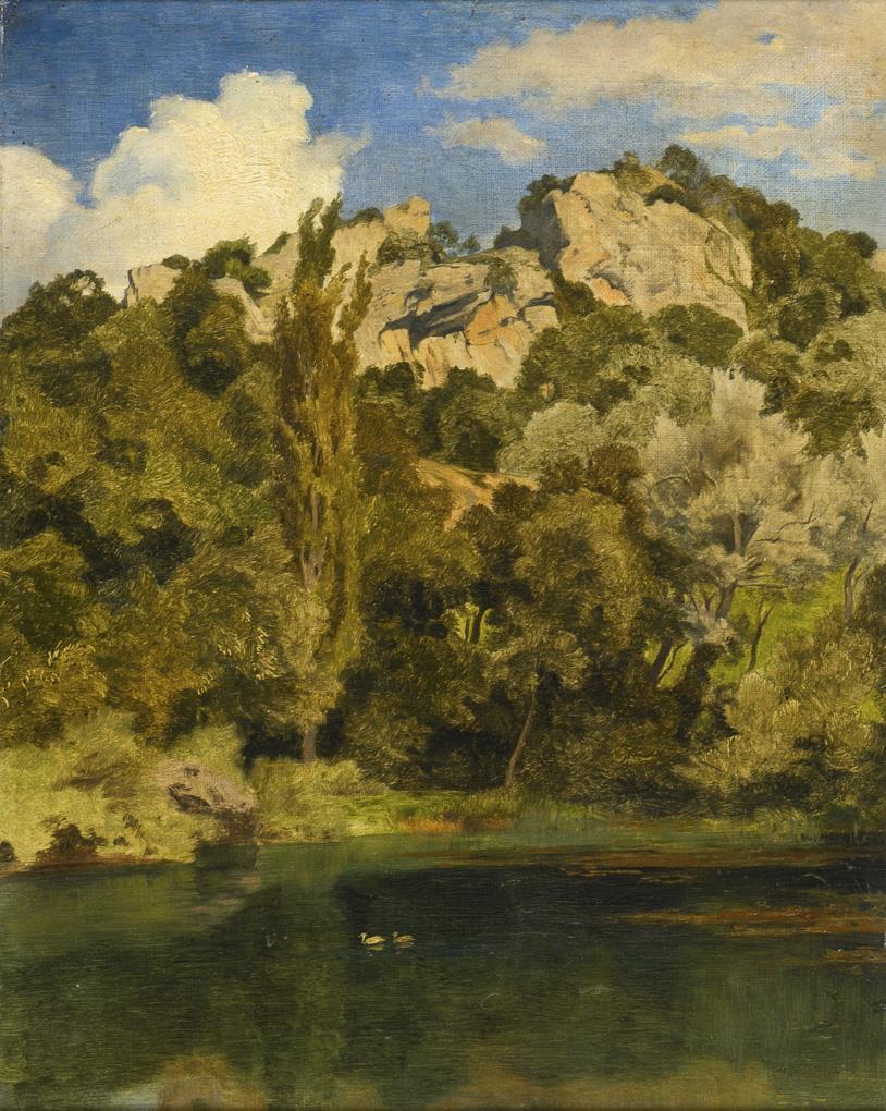 Enten auf dem See im warmen Sonnenschein vor dem felsigen Hang unter blauem Himmel. Vergilbter Firnis.