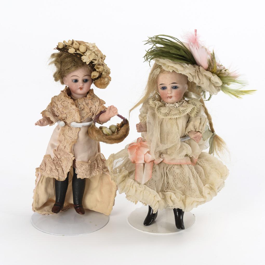 Ganzbiskuit-Püppchen mit Kurbelkopf, blauen Glasaugen, blonder Mohairperücke, hellem Kleid, Hut und modellierten Schuhen. 1x mit großem Federhut, 1x mit Wattekörbchen. Köpfe durchleuchtet: ohne Defekte.