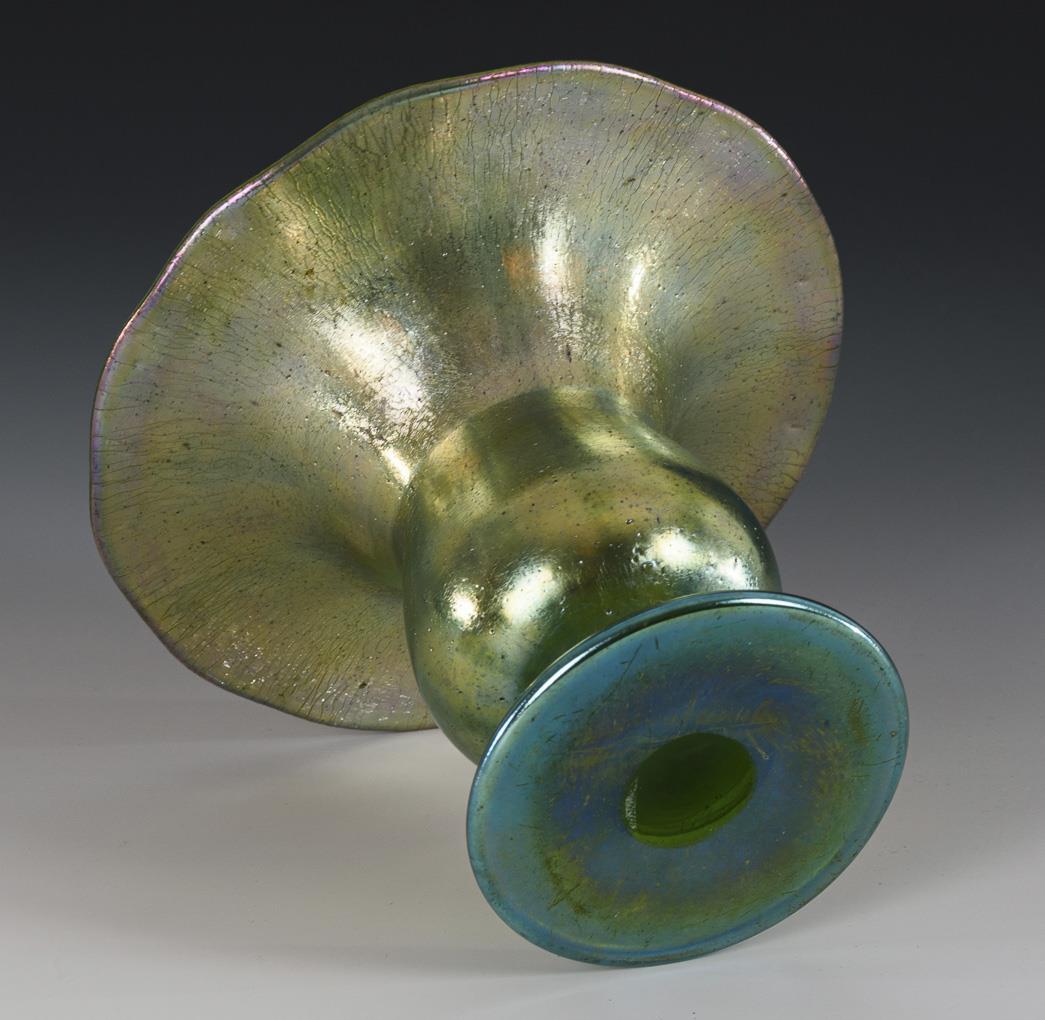 Bernsteinfarbenes und grünes Glas mit silbergelben Kröselaufschmelzungen, stark irisiert. H 13 cm.