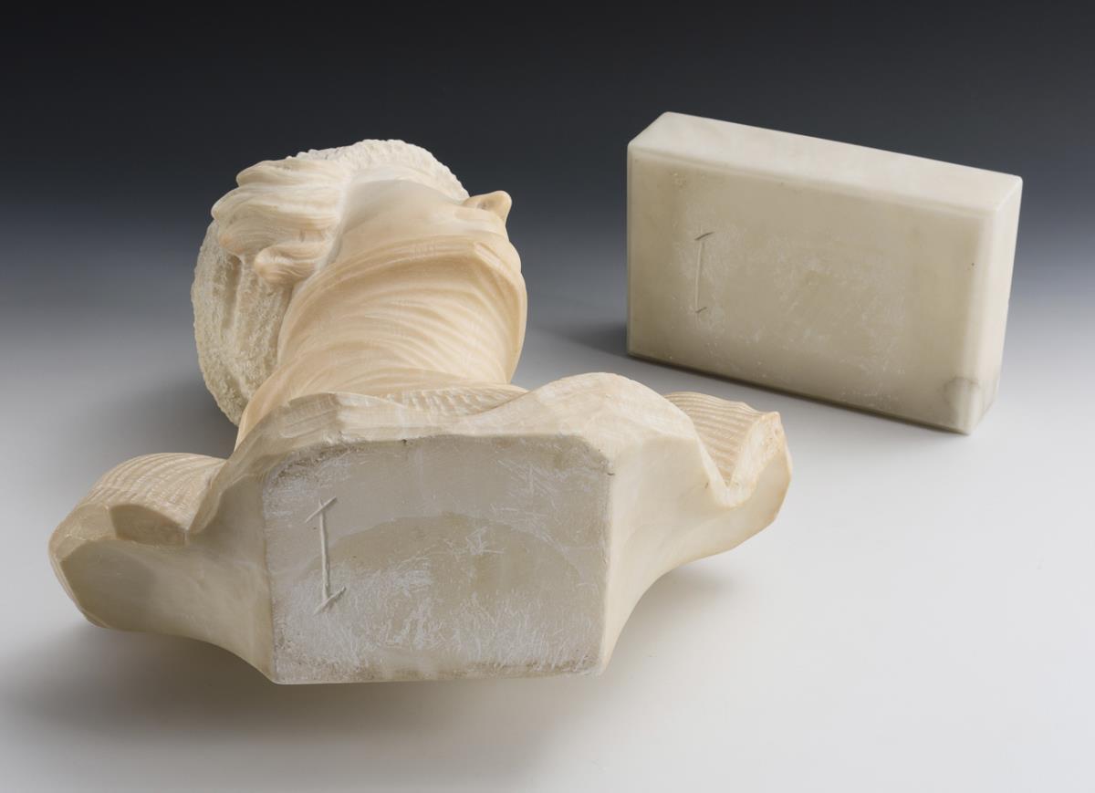 Auf einem Alabastersockel mit Blattfries in der Front stehende Büste einer jungen Frau in hoch geschlossenem Kleid sowie mit Haube