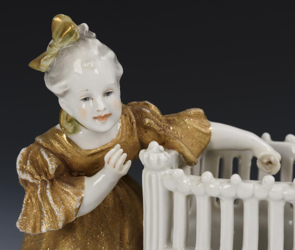 1x Porzellan, 1x Keramik. Je ein Rokokomädchen im goldenen Kleid an einer gerippten Vase mit durchbrochenem Rand stehend. Gold etwas berieben.