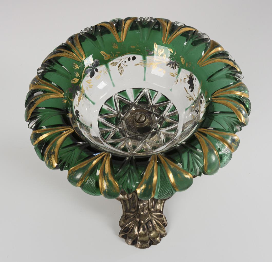 Schale aus farblosem Glas mit grünem Überfang, Kerb-, Steinel- und Facettenschliff und Goldstaffage, Metallfuß.