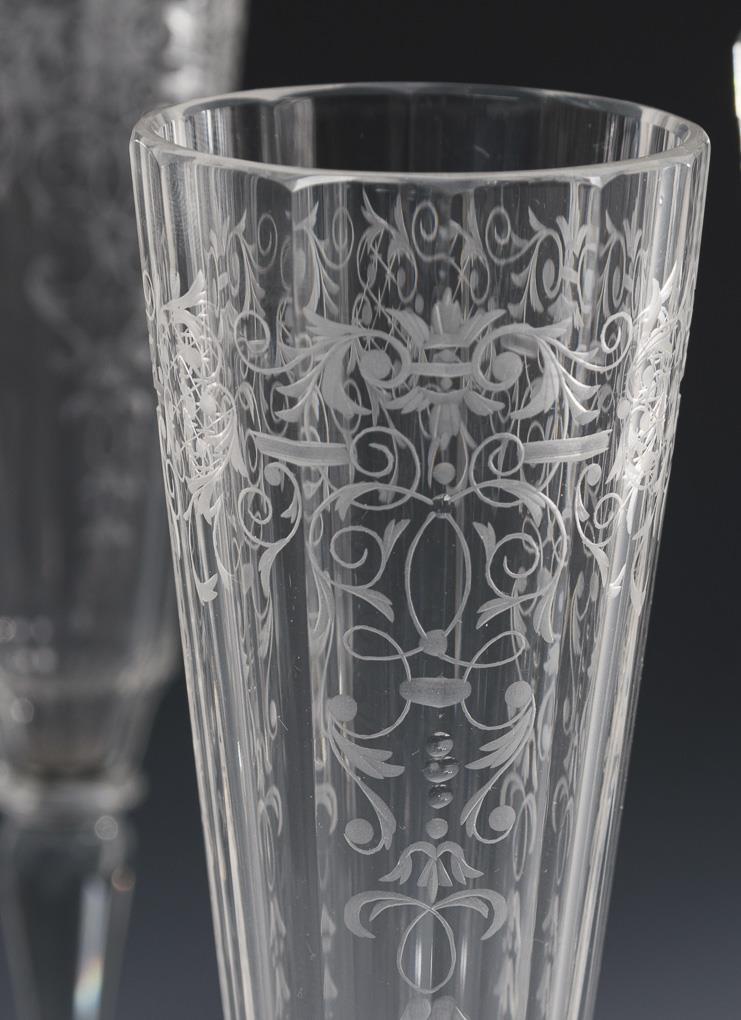6 Sektflöten mit Ornamentgravur. Lobmeyr.
