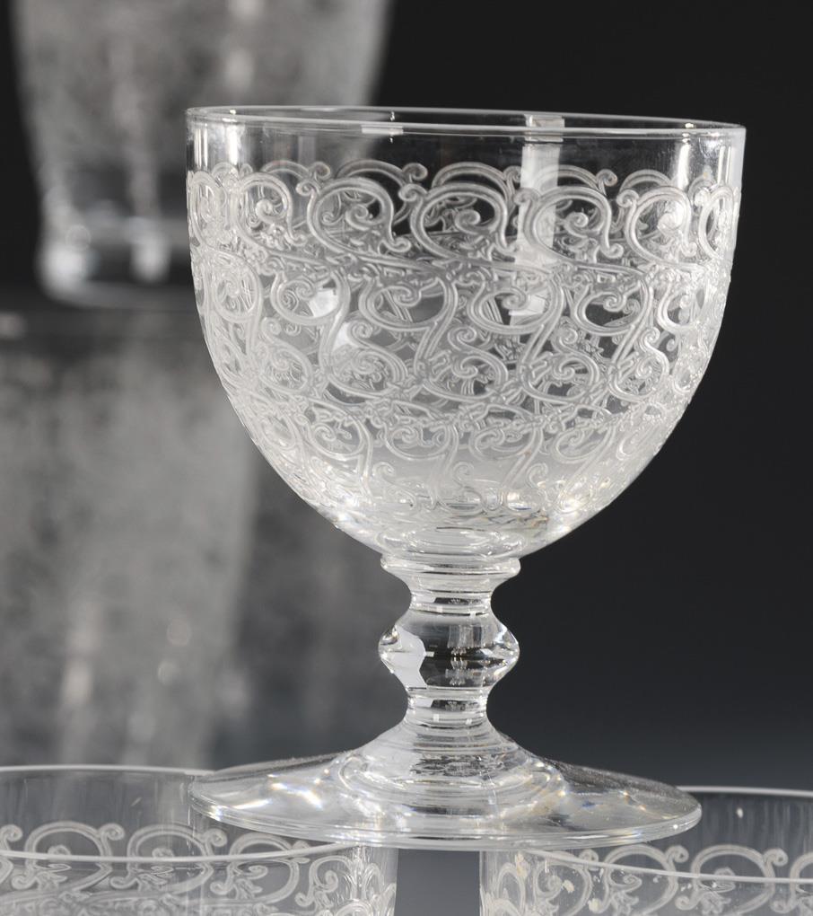 Umlaufend ornamentales Ätzdekor. 7 Sektkelche (H 14,5 cm), 6 Becher (H 10,5 cm), 7 Kelchgläser (H 10,5 cm) und 3 Likörgläser (H 7,5 cm).