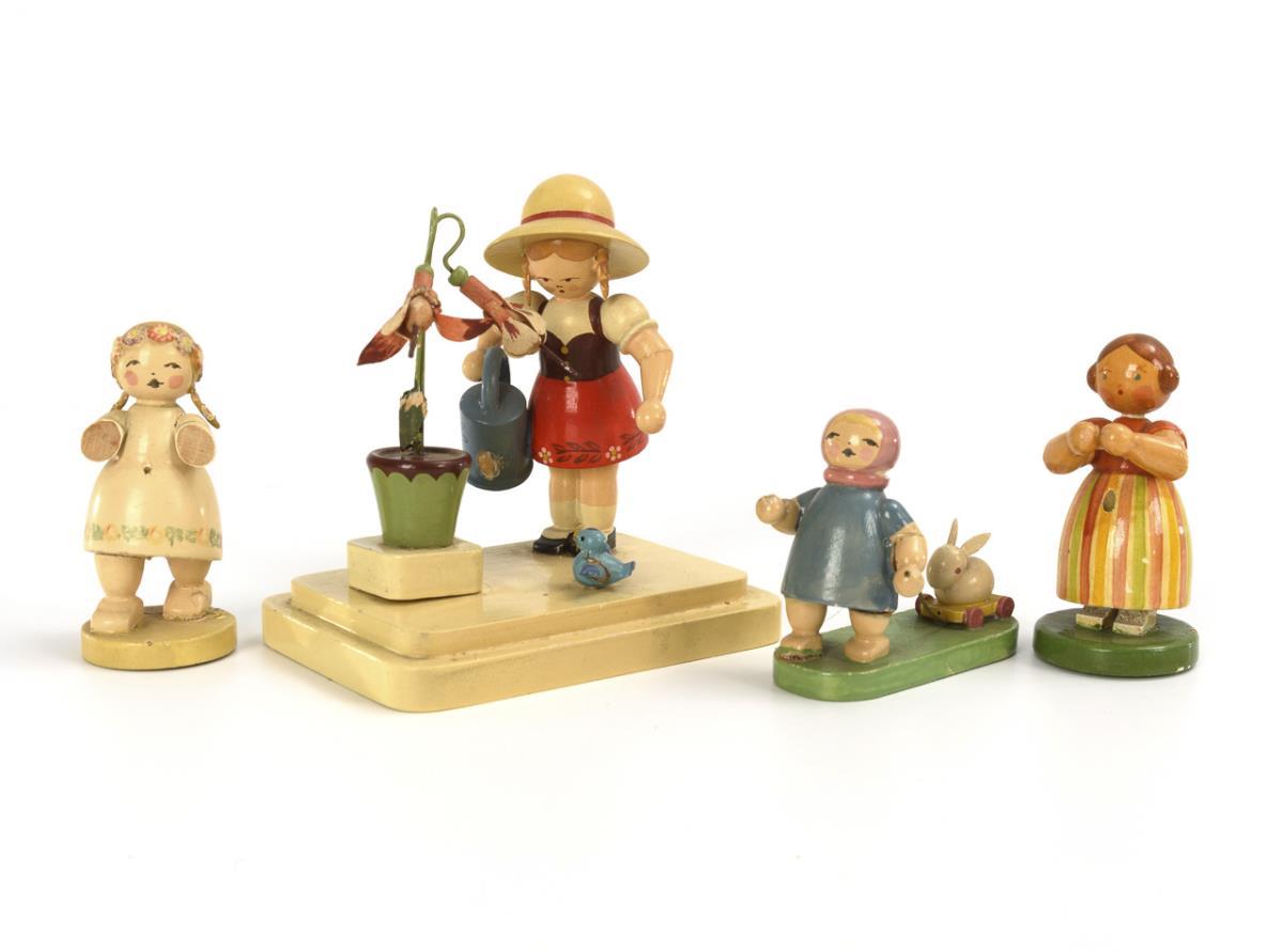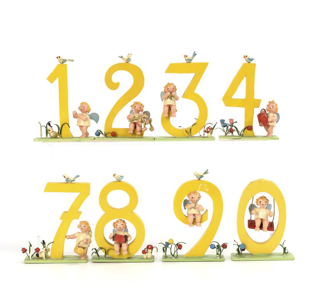 13 Blumenkinder, 1 Laternenkind, 8 Engelchen mit Zahlen (5 und 6 fehlend), sowie 2 weitere Figürchen auf Sockel und 1 defektes Blumenkind. Teils mit stärkeren Defekten und Klebestellen.