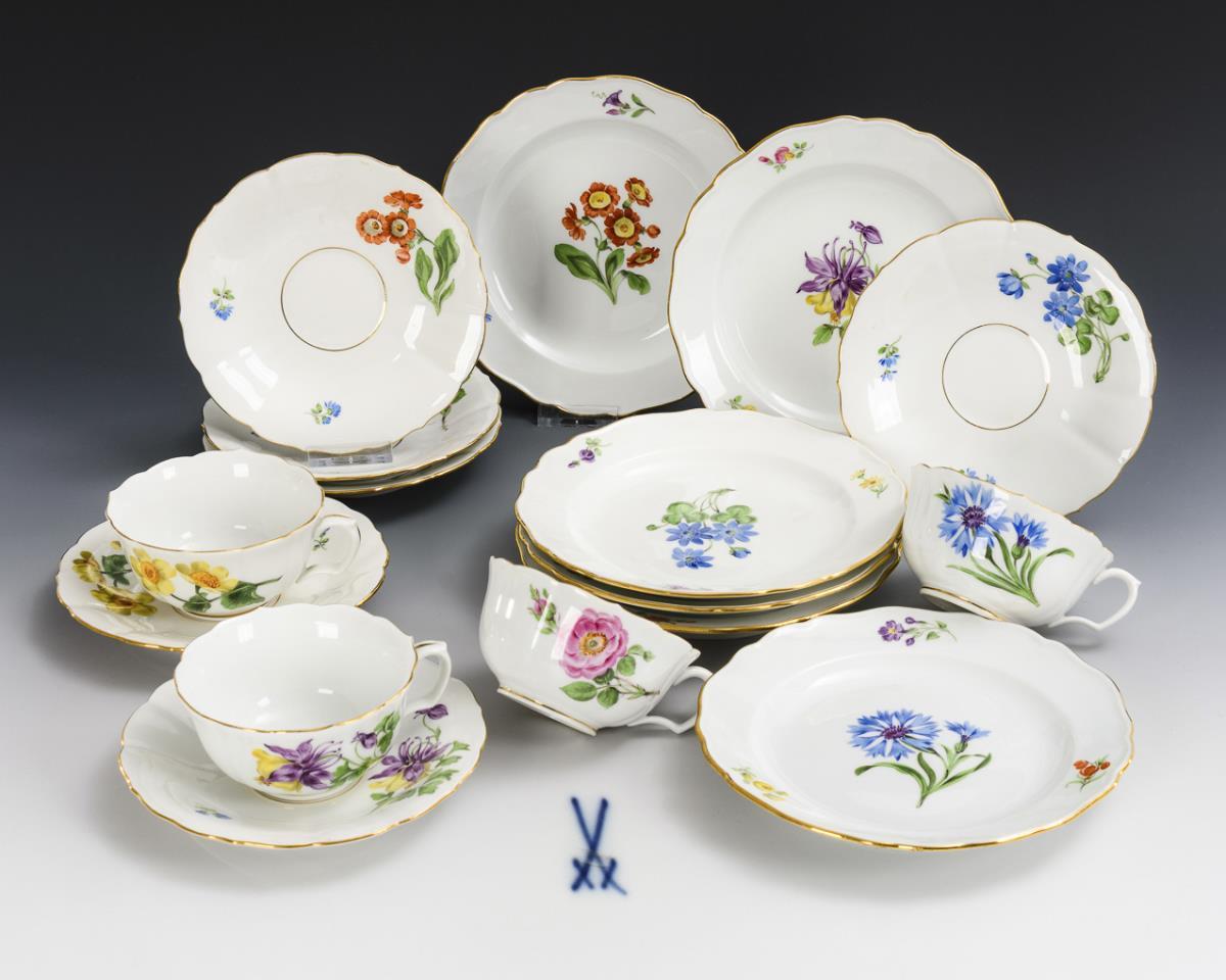 Polychrome Blumenmalerei, Goldstaffage. 4 Teetassen (H 5 cm), 6 Untertassen (Ø 15 cm), 6 Kuchenteller (Ø 18 cm).
