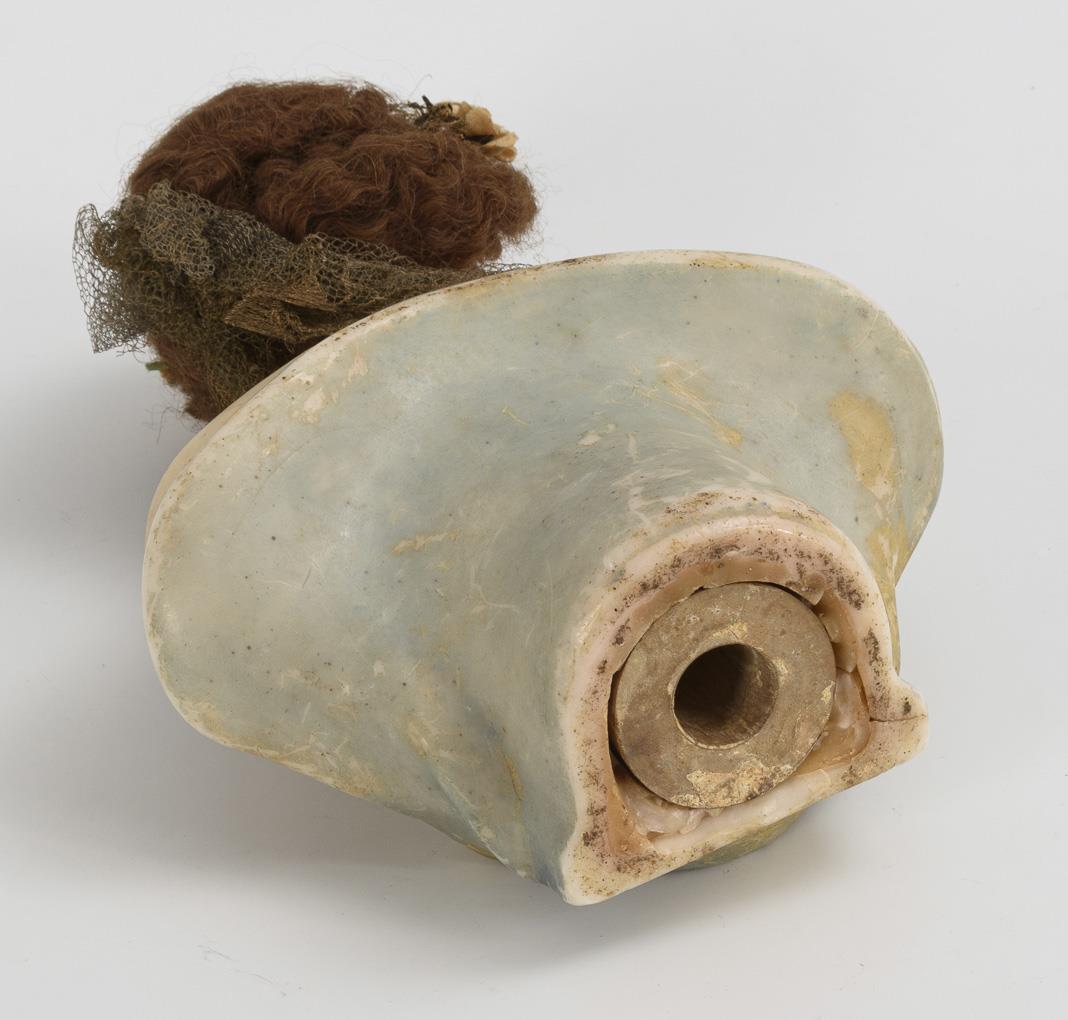 Geheimnisvoll lächelnde junge Frau mit zur Seite gewendetem Kopf. Gemalte Augen sowie kastanienbraunes Haar mit Schmuck. In der Standfläche originale konische Hartholzbuchse für einen minimal konischen Haltedorn (ca. 25 mm). Teils berieben, Haarriss am Stand.