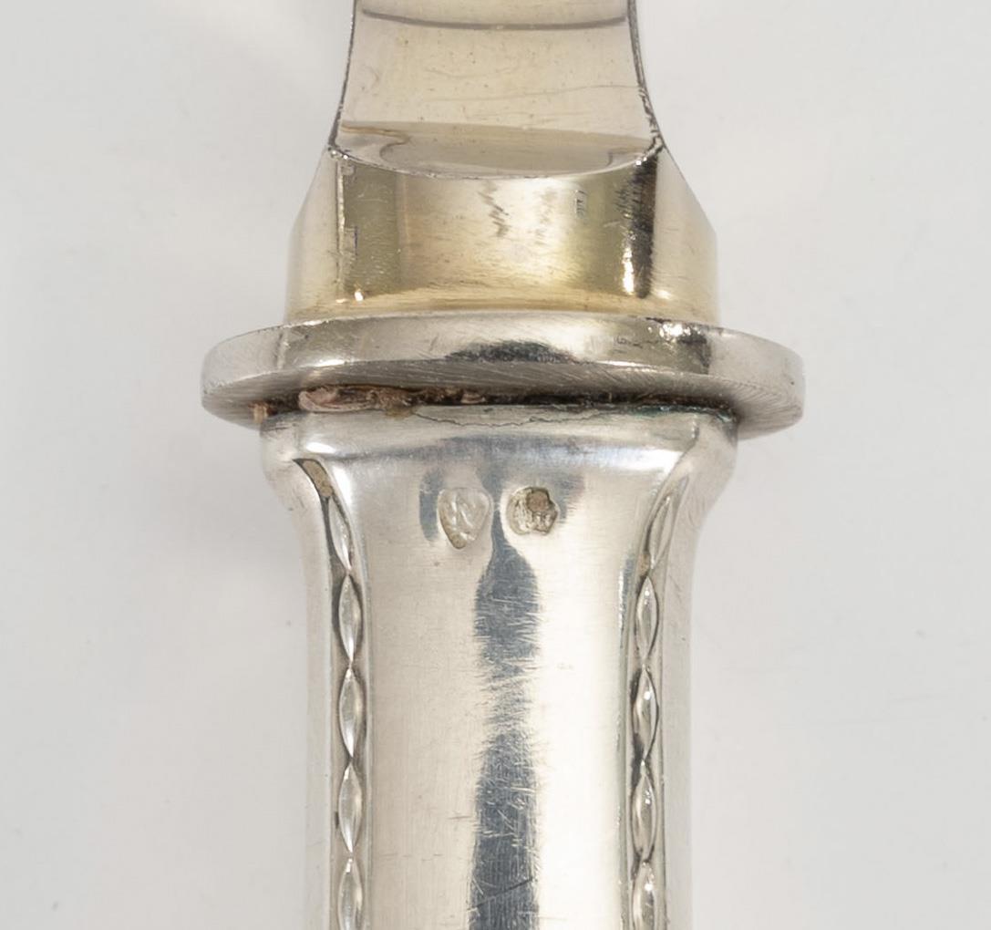 Vorlegegabel und -messer mit schlichtem Kantendekor und Monogrammgravur "E". Minimale Gebrauchsspuren.