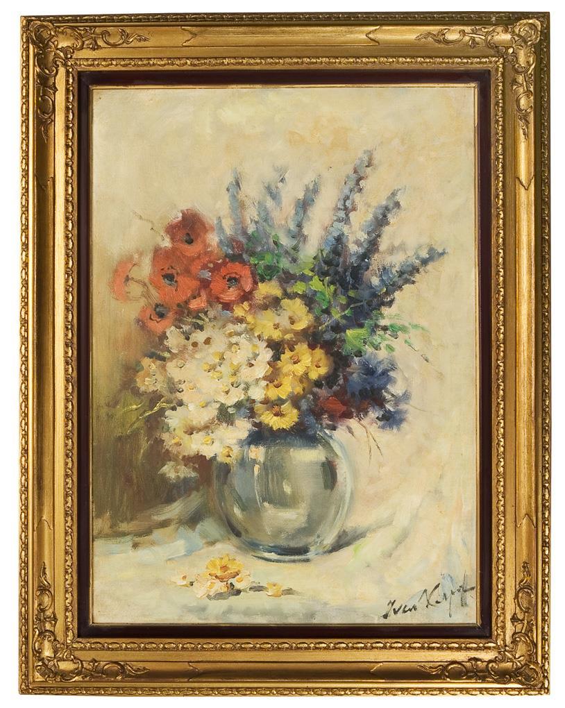 Ein buntes, harmonisch arrangiertes Ensemble in zartem Kolorit. Vergoldeter Stuckrahmen.