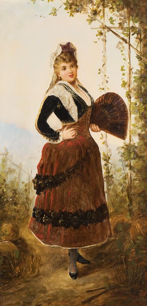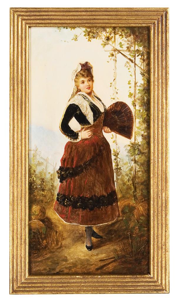 Fein und detailreich gemalte kleinformatige Standbildnisse, ländliche Tracht und städtische Mode stehen hier im Kontrast. Profilierte Goldrahmen.