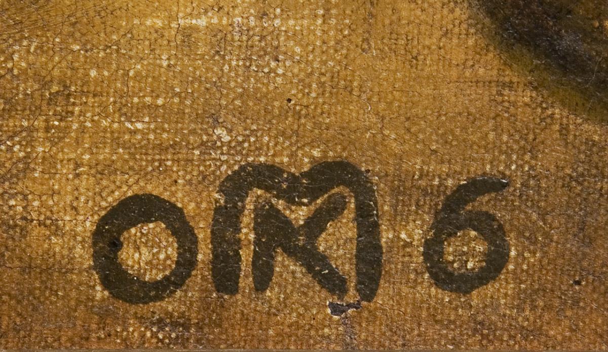 Versetzt angeordnete fünf verschiedene Pflanzen in Tontöpfen, die fast einen beiläufigen Eindruck erzeugen, sie wirken nicht wie arrangiert. Bei dem Monogramm wird ein K von einem M eingerahmt, die Jahreszahl flankiert die Buchstaben. Geschwärzter Profilrahmen mit schmaler Goldleiste. Doubliert, Rahmen partiell defekt.