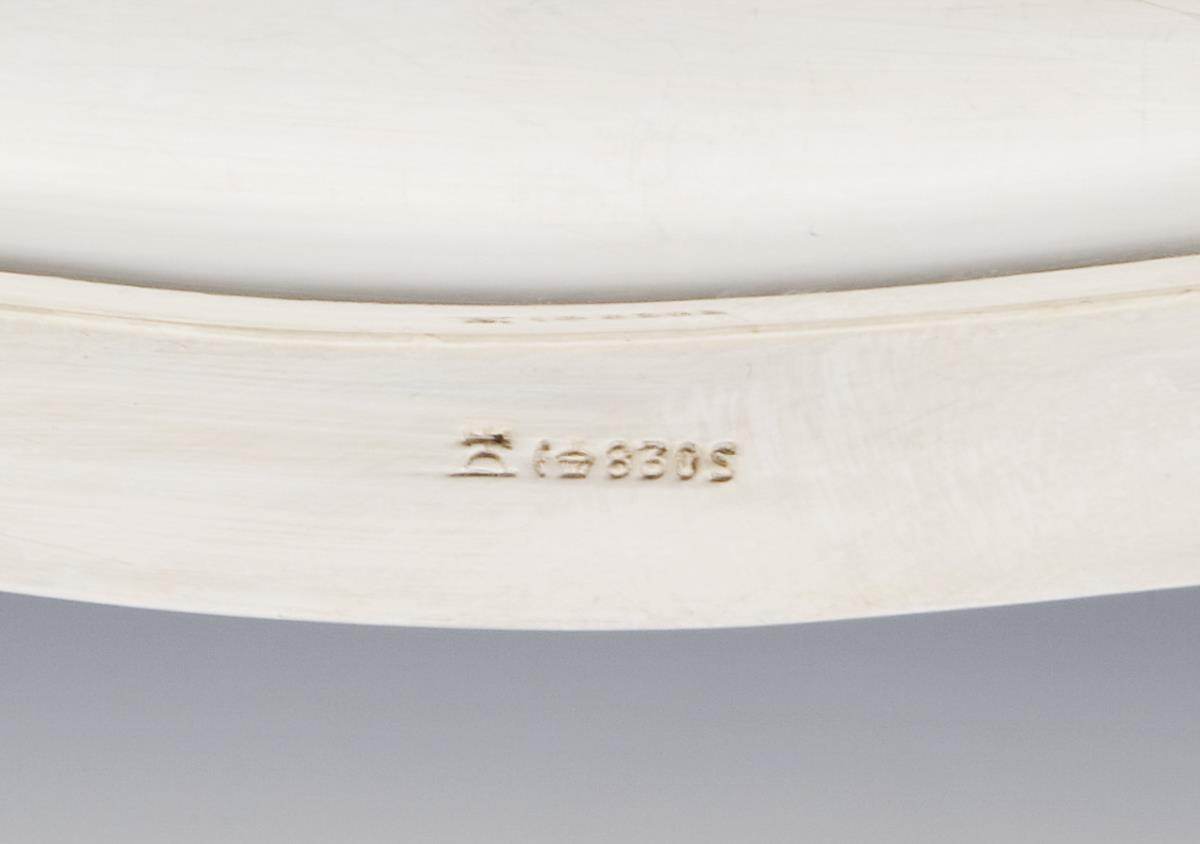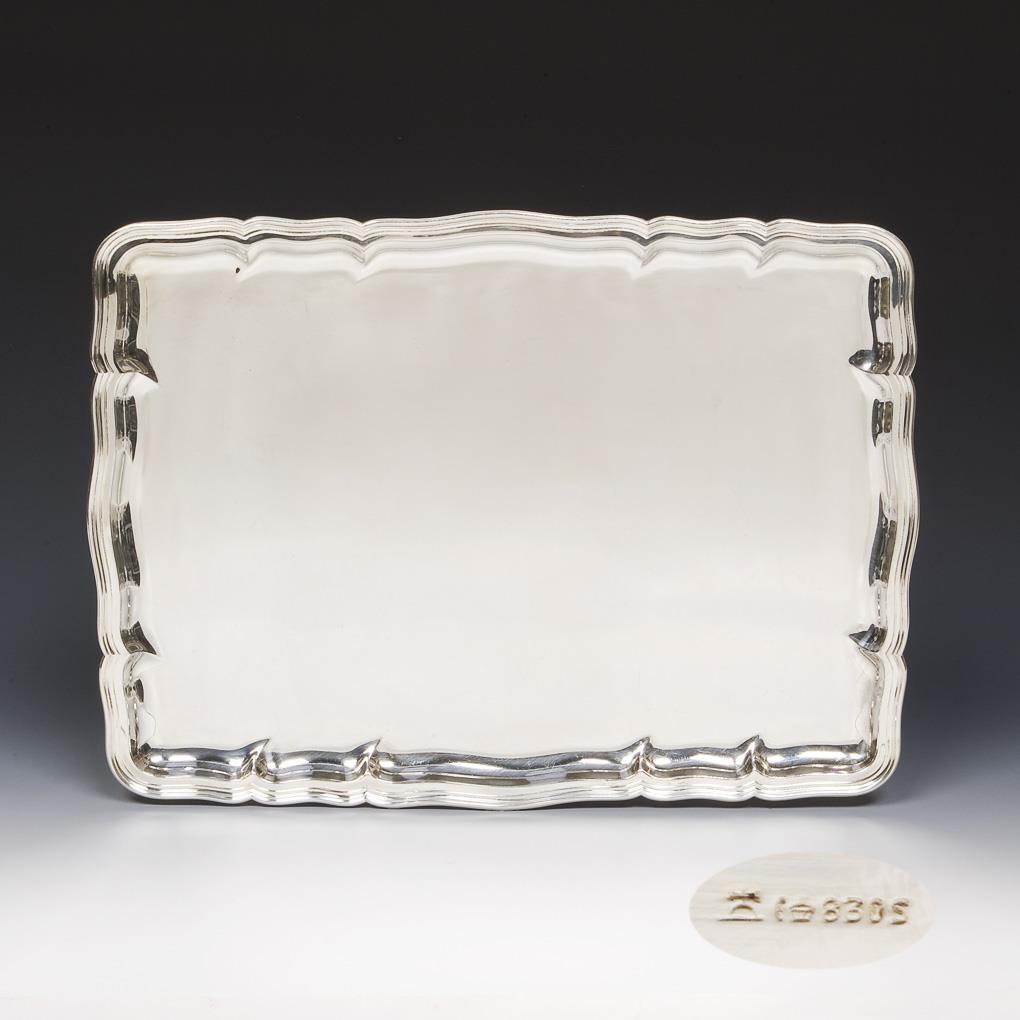 Passig geschweifte rechteckige Form mit vollem Profilrand. Schwere qualitätvolle Ausführung. Punzen: Halbmond und Krone, Feingehalt, Fabrikmarke, Modell-Nr., Maßangabe.