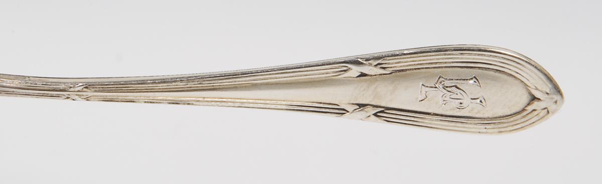 Graviertes Monogramm JM, Laffen vergoldet. Punzen: Halbmond und Krone, Feingehalt, Fabrikmarke. Etui von Oscar Rieck, Hofjuwelier, Greiz.