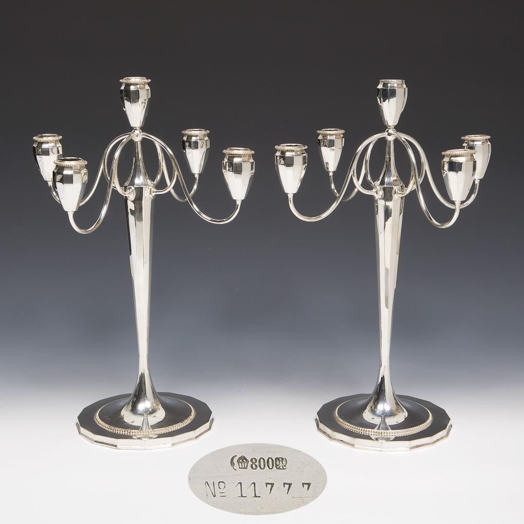 Schlanke 5-flammige Standleuchter mit vier geschwungenen Leuchterarmen und zeitlosem Facetten- und Perlleistendekor. Punzen: Halbmond und Krone, Feingehalt, Fabrikmarke. Ein Tülleneinsatz fehlt.