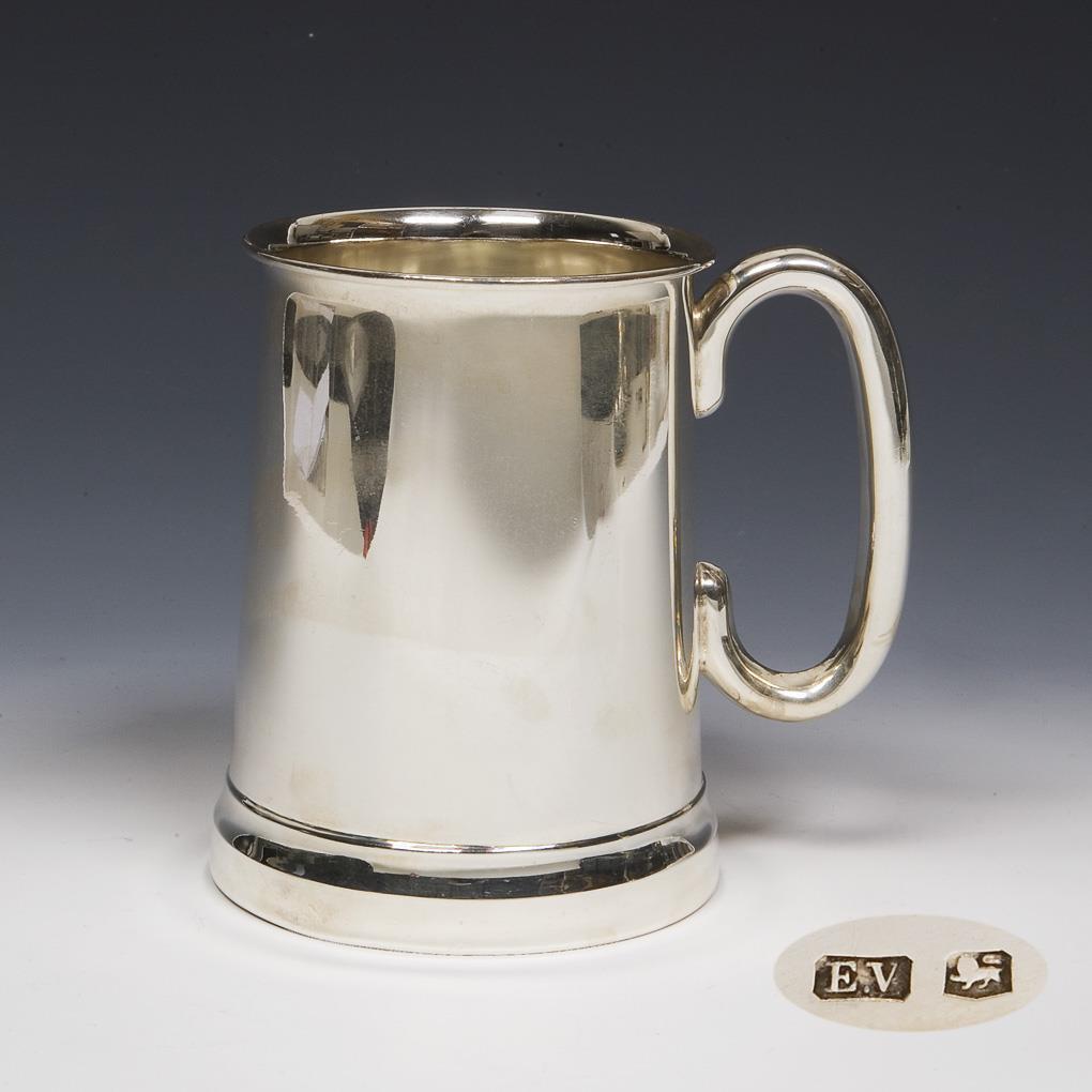 Schlichter glatter Korpus mit profiliertem Ansatz und Lippenrand, C-förmiger Henkel, farbloser Glasboden.
