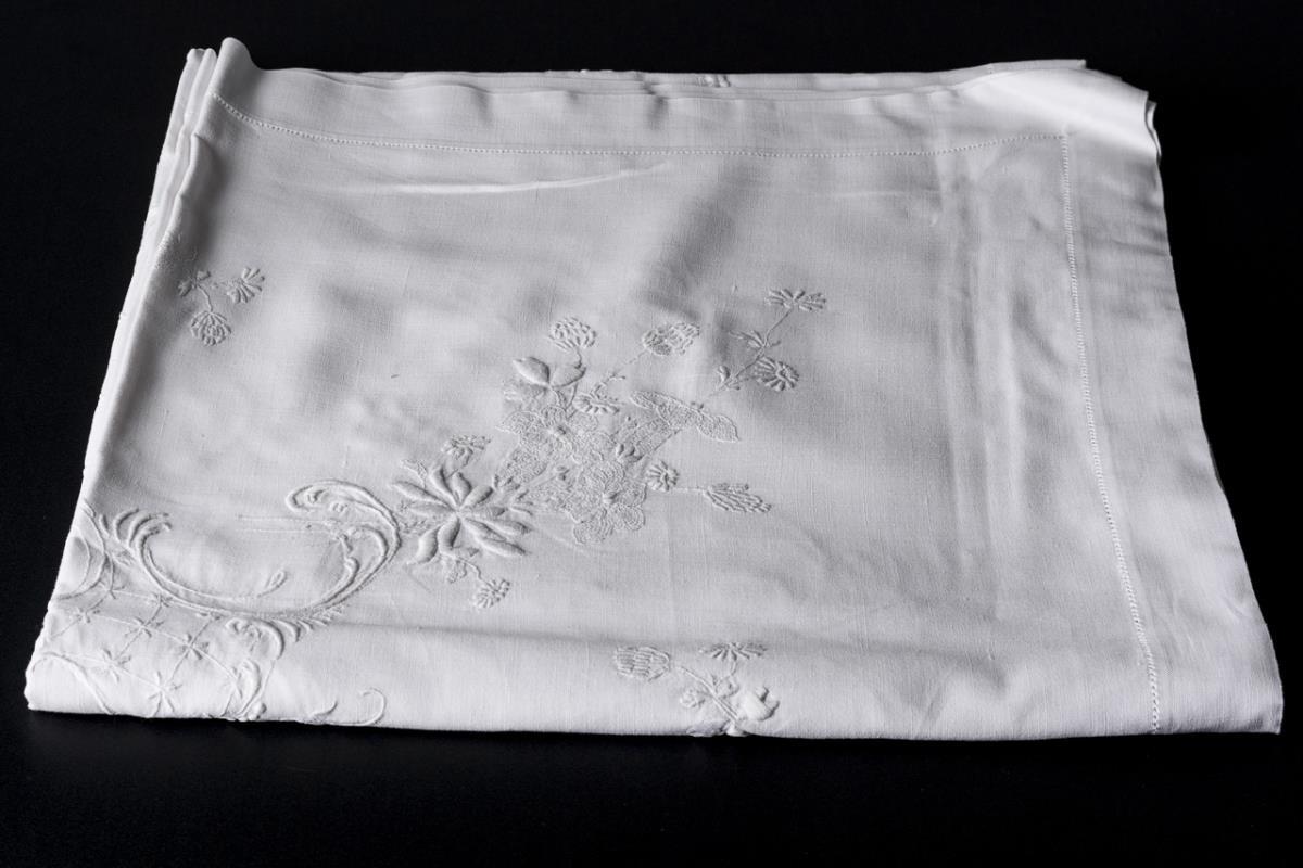Sehr feiner Baumwollgrund mit reichhaltiger und sorgfältiger Stickerei im Rokoko-Stil. 158 x 154 cm.