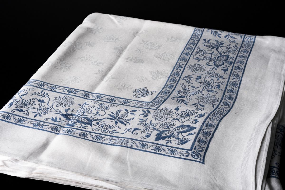 Seltenes großes Tafeltuch mit eingewebtem Meißener Zwiebelmuster.