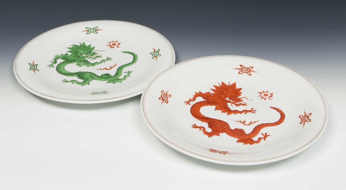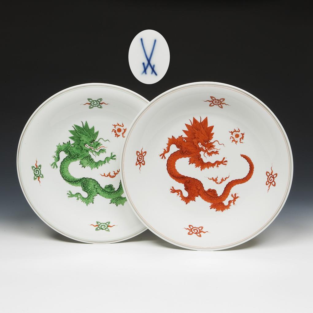 Bemalung in Korallenrot und Grün. Dekor "Mingdrache". Pressmarken, eine Ritzmarke, eine Malermarke, Schwertermarken.