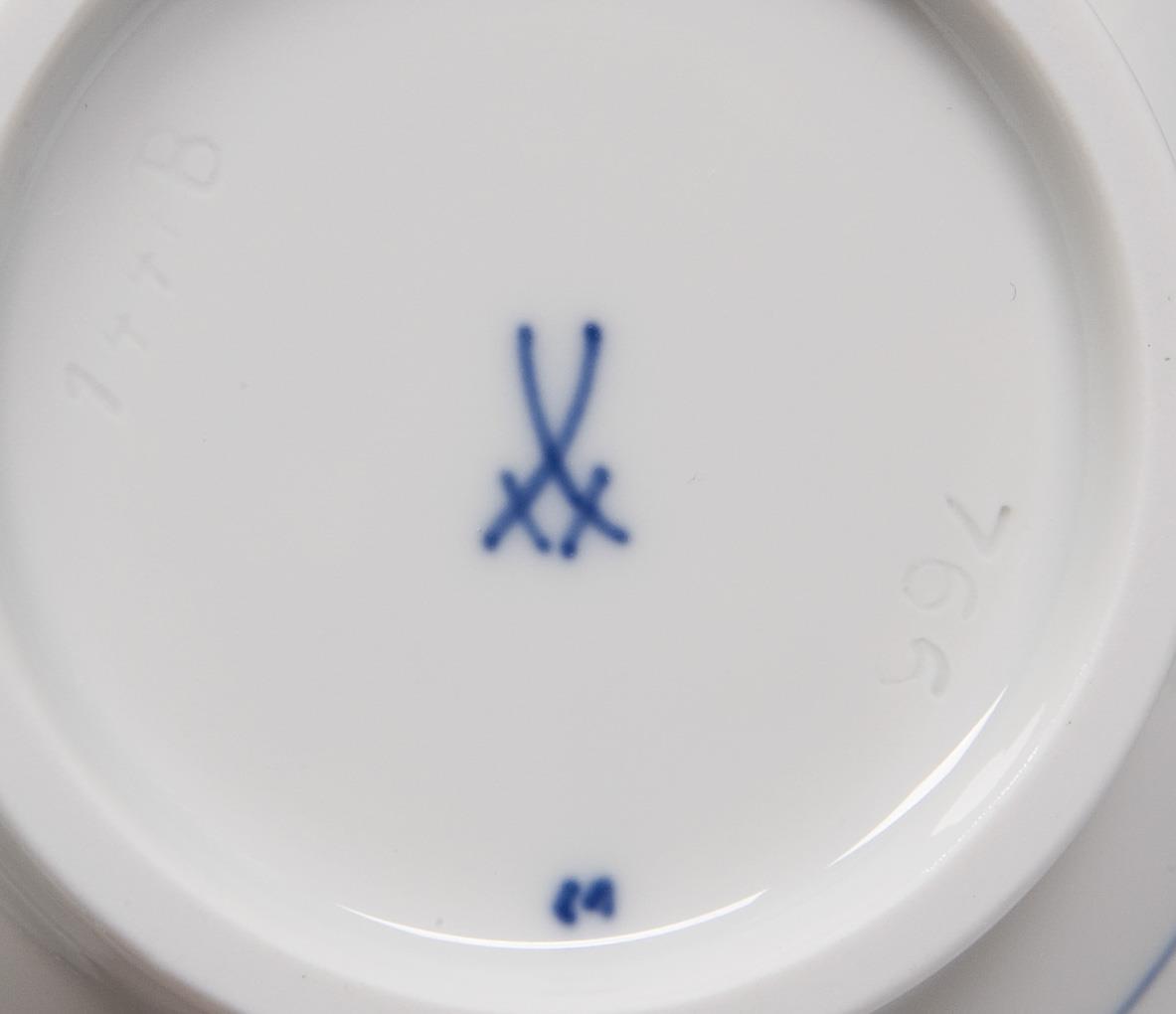 Form "Neuer Ausschnitt", kobaltblaue Unterglasurmalerei, "Zwiebelmusterdekor", Dekor-Nr. 800101. Pressmarken, Malermarken, Schwertermarken, Schalen dreimal gestrichen.