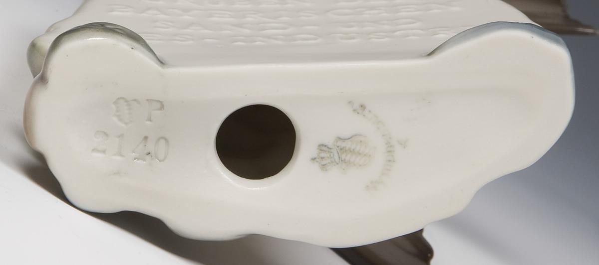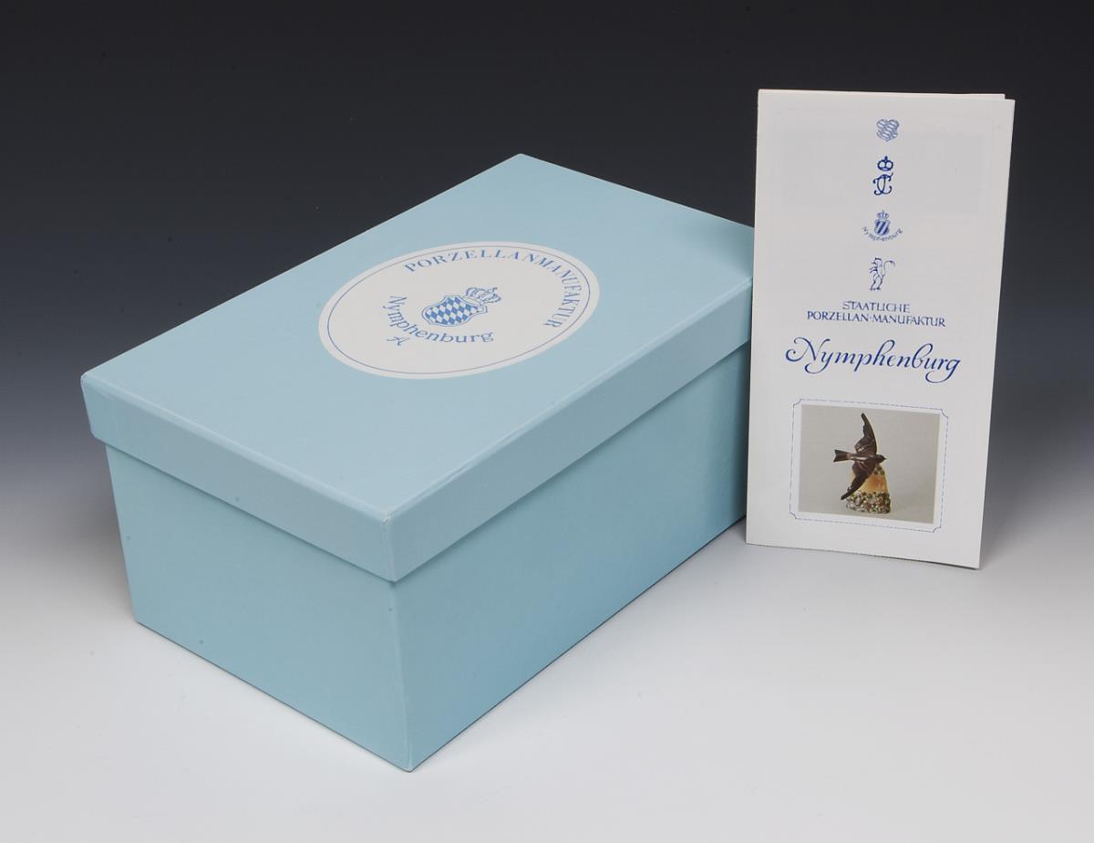 Modell von Carl Vezerfi-Clemm 1985, farbig bemalt. Rückseitig reliefierte Schriftzüge: Uferschwalben brüten in Gruben der bayrischen Sand- und Kies-Industrie. Unglasierter Boden, Bodenmarke mit A für Herzog Albrecht von Bayern, Pressmarken, am Sockel Künstler-Signet, im Original-Karton.