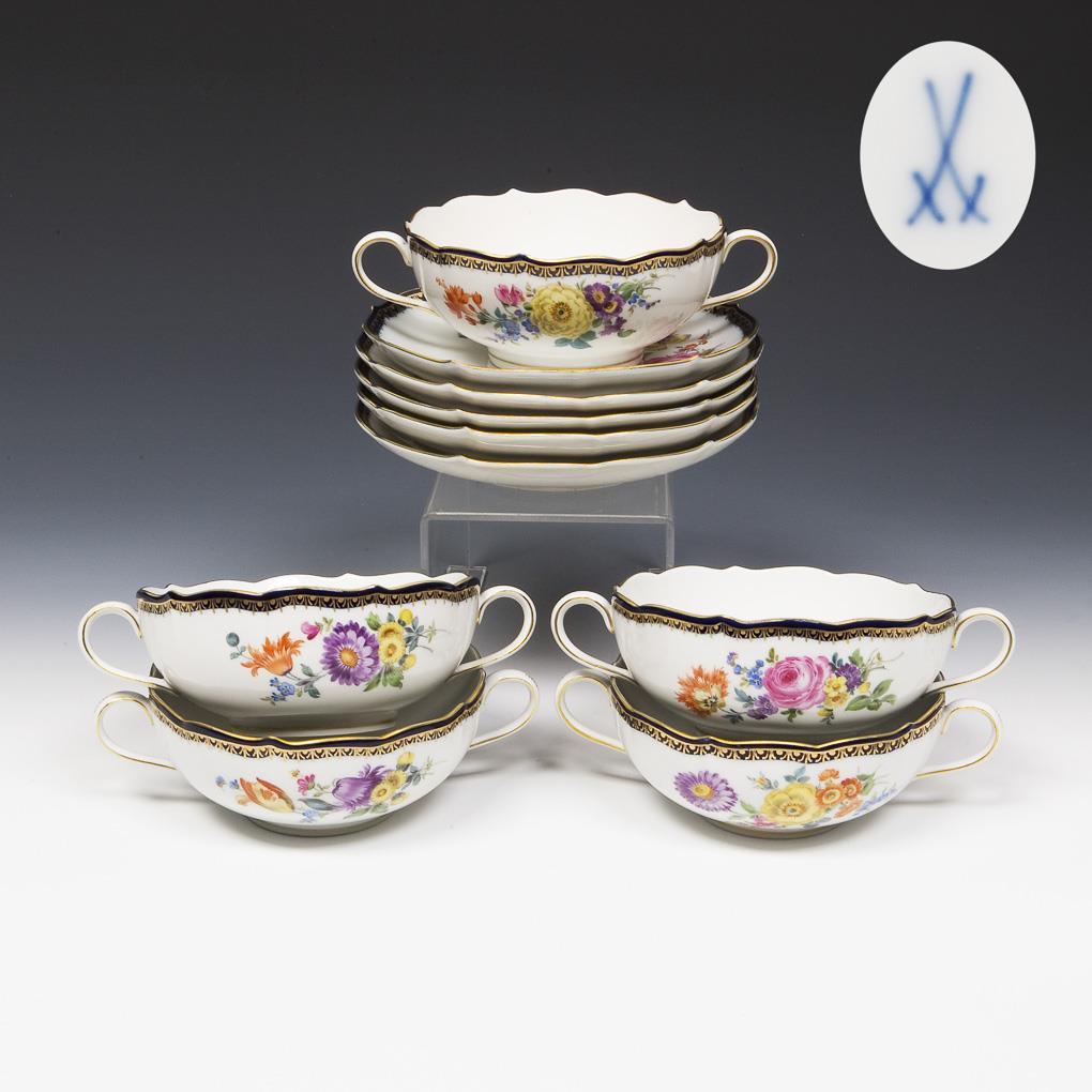 5er Satz Suppentassen, Untertassen. Meissen.