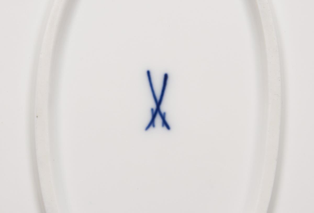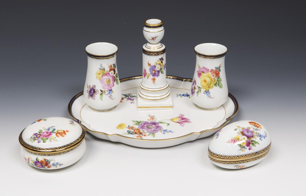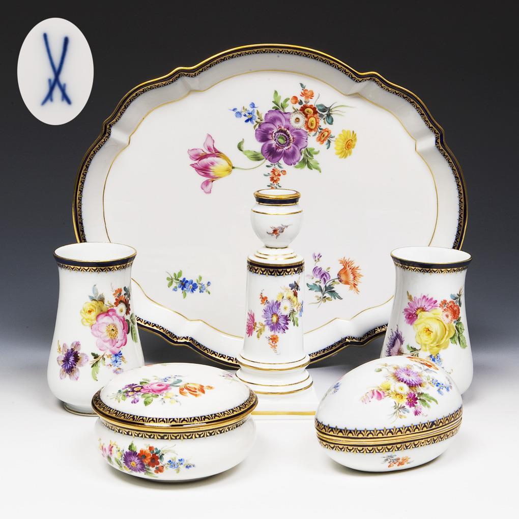 Dekor-Nr. 111120, farbige Blumenbemalung mit schräggestelltem Bukett und Einzelblüten, kobaltblauer Rand mit goldener "A-Kante", Goldstaffage. 6 Teile: 1 Tablett, 2 Dosen, 1 Leuchter, 2 Vasen. Malermarken, Pressmarken, Schwertermarken. Dosen 1935-1947, Tablett 1955. Tablett-Standring, Leuchter-Sockel von unten leicht, am Rand minimal bestoßen.