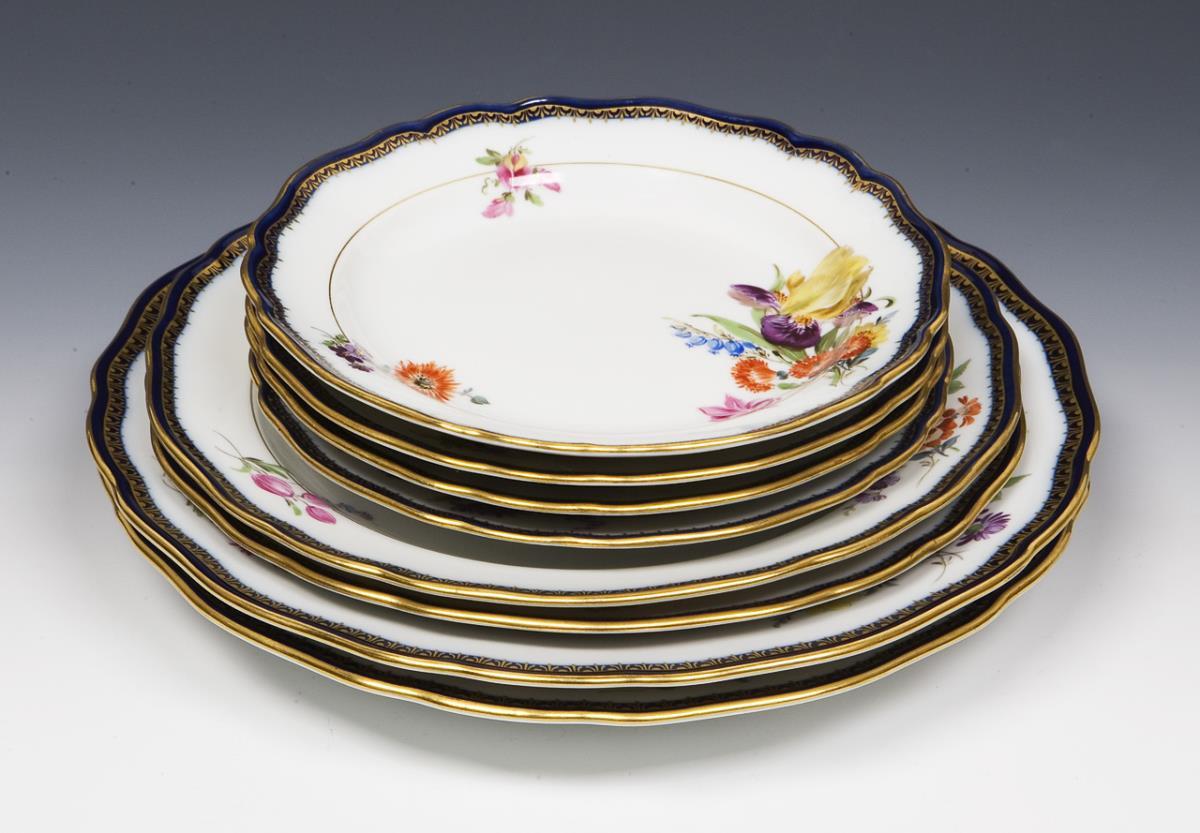 Form "Neuer Ausschnitt", Dekor-Nr. 111120. Farbige Blumenbemalung mit schräggestelltem Bukett und Einzelblüten, kobaltblauer Rand mit goldener "A-Kante", Goldstaffage. 2 Essteller, 2 große Dessertteller, 4 kleine Dessertteller. Schwertermarken, vier Schwertermarken mit Punkt. Ein schmaler Goldrand berieben.