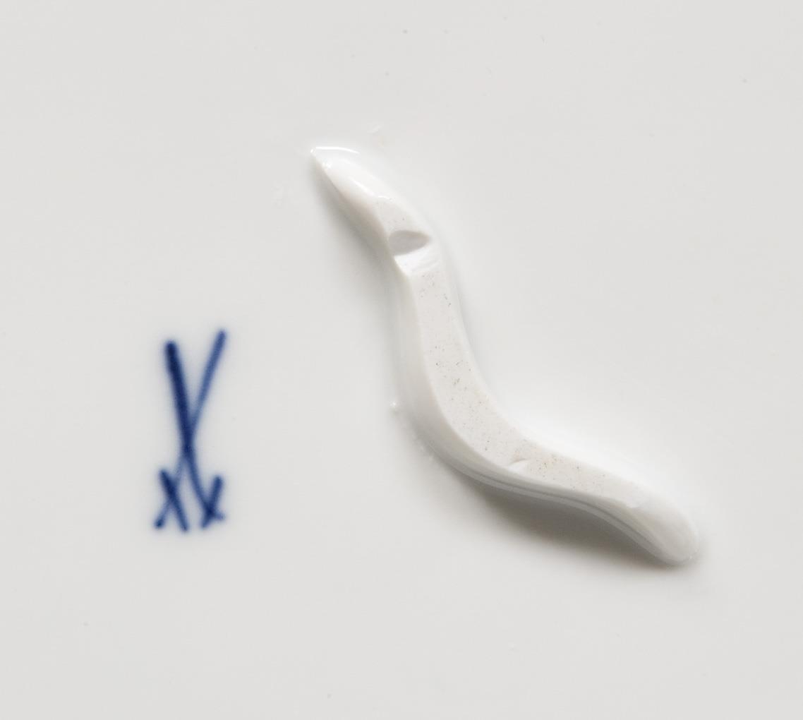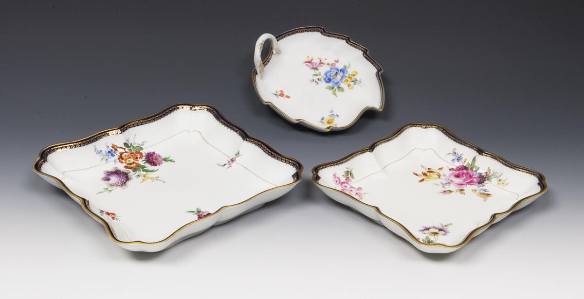 Form "Neuer Ausschnitt", Dekor-Nr. 111120. Farbige Blumenbemalung mit schräggestelltem Bukett und Einzelblüten, kobaltblauer Rand mit goldener "A-Kante", Goldstaffage. 2 quadratische Schalen, 1 Blattschale. Malermarken, Pressmarken, Schwertermarken. Ein Standring leicht bestoßen, eine Blüte berieben.