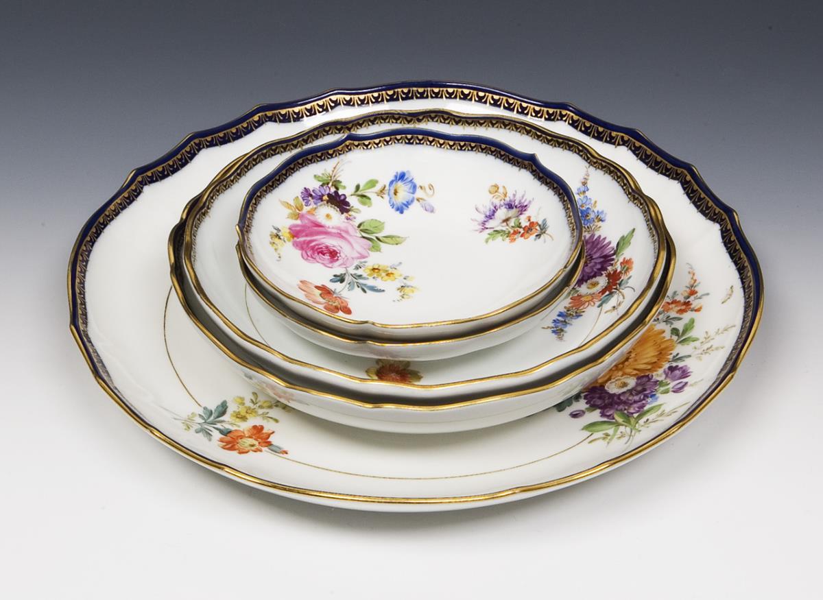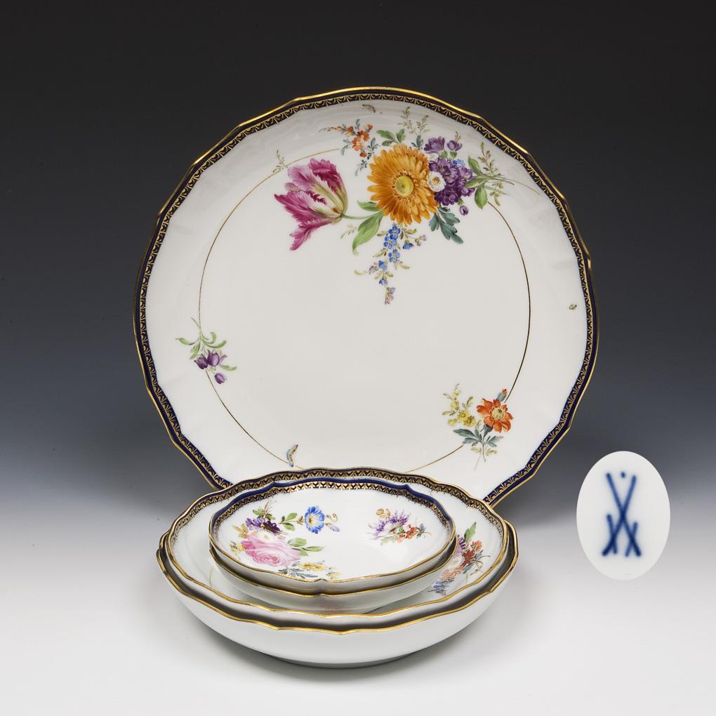 Form "Neuer Ausschnitt", Dekor-Nr. 111120. Farbige Blumenbemalung mit schräggestelltem Bukett und Einzelblüten, kobaltblauer Rand mit goldener "A-Kante", Goldstaffage. Schwertermarken, zwei Schwertermarken mit Punkt.