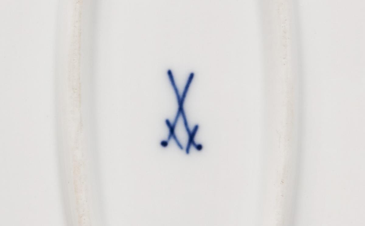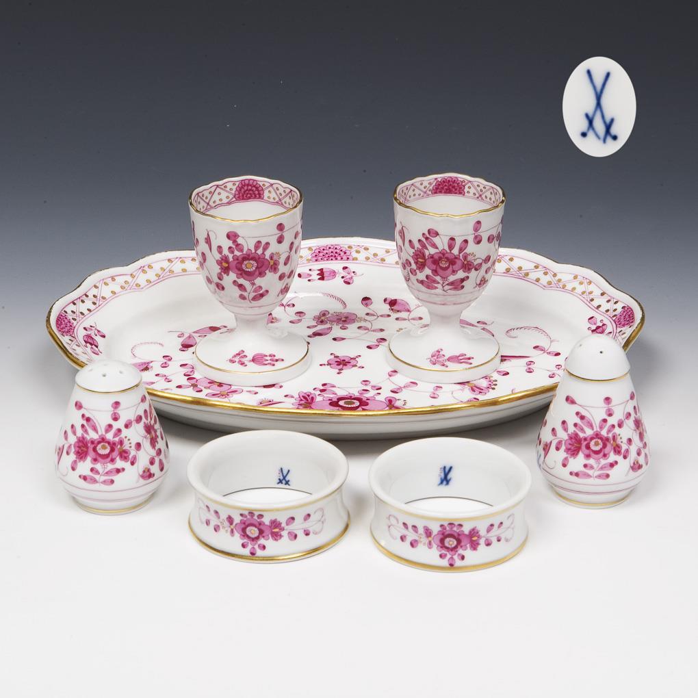 Dekor-Nr. 343410, Camaieu-Malerei, Dekor "Indisch-Purpur" mit Goldpunkten, Goldstaffage. 7 Teile: 1 Platte, 2 Eierbecher, Salzstreuer, Pfefferstreuer, 2 Serviettenringe. Schwertermarken, Platte 1880-1923.