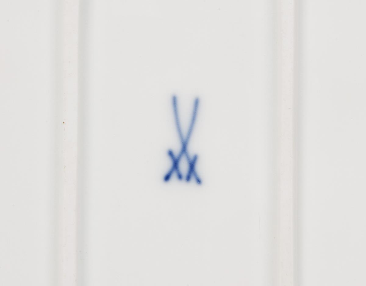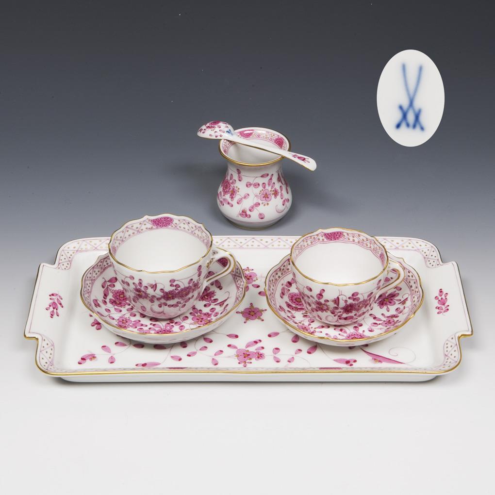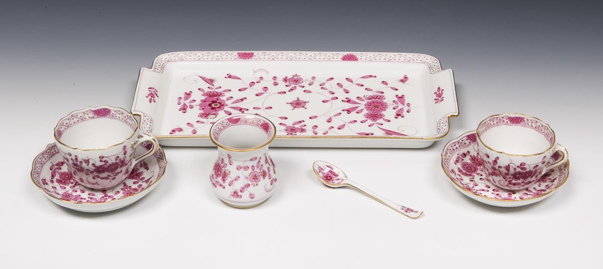 Dekor-Nr. 343410, Camaieu-Malerei, Dekor "Indisch-Purpur" mit Goldpunkten, Goldstaffage. Schwertermarken, eine Untertasse viermal gestrichen.