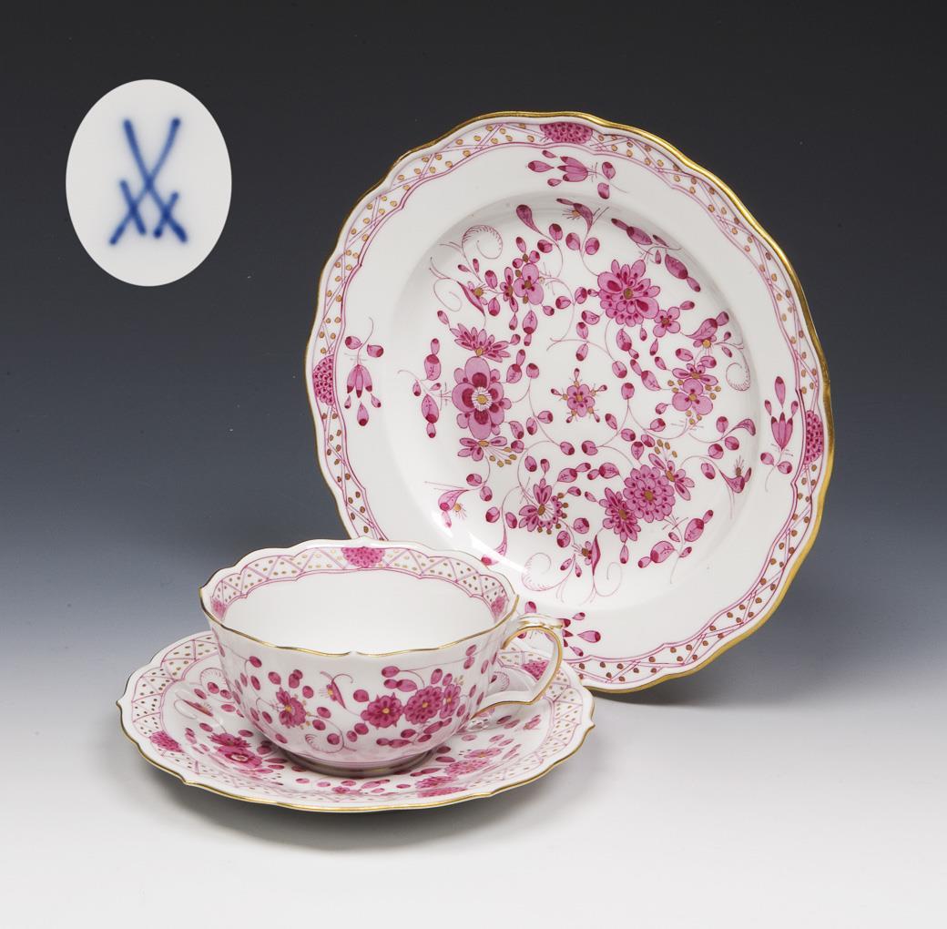 Form "Neuer Ausschnitt", Dekor-Nr. 343410. Camaieu-Malerei, Dekor "Indisch Purpur" mit Goldpunkten, Goldstaffage. Pressmarken, Malermarken, Schwertermarken, Teller 1880-1923.