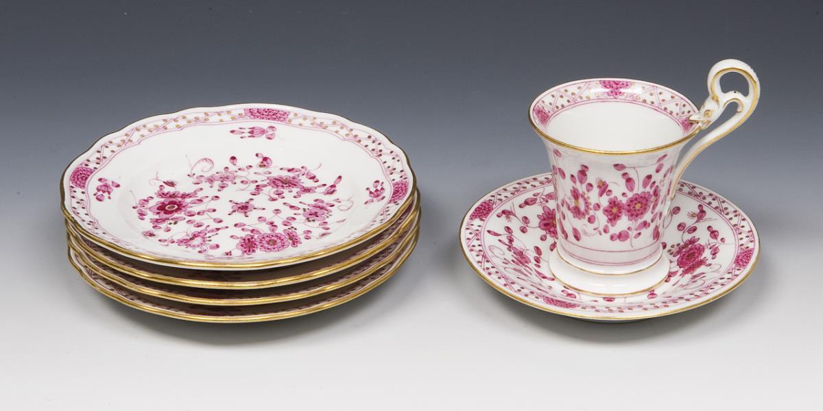 Dekor-Nr. 343410, Camaieu-Malerei, Dekor "Indisch-Purpur" mit Goldpunkten, Goldstaffage. Pressmarken, Schwertermarken, Untertasse 1924-1934.
