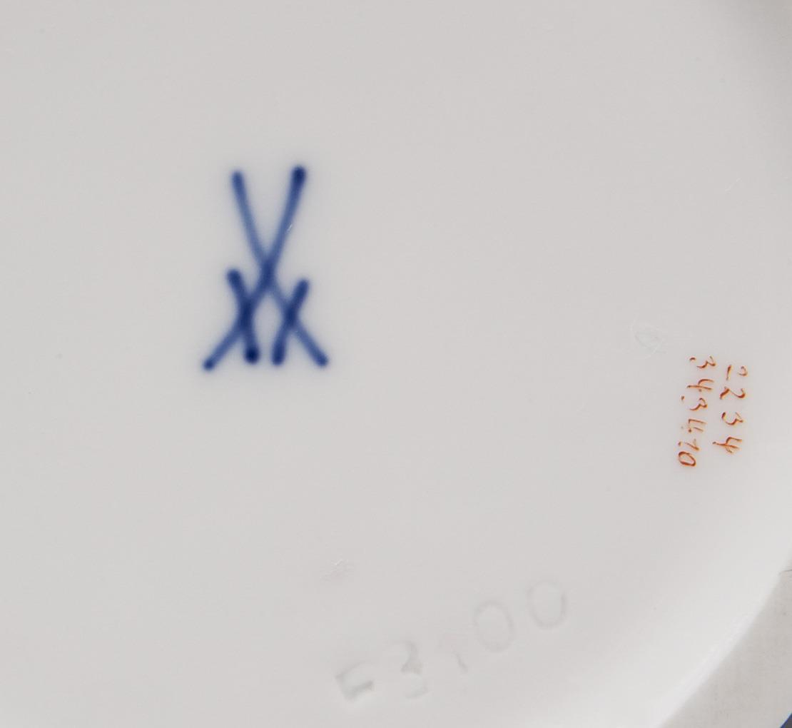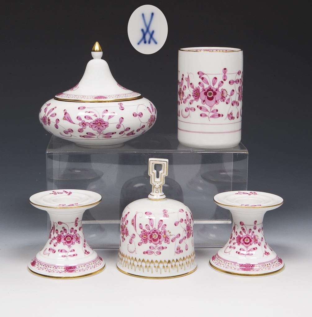 Dekor-Nr. 343410, Camaieu-Malerei, Dekor "Indisch-Purpur" mit Goldpunkten, Goldstaffage. 5 Teile: 1 Dose, 1 Tischglocke, 1 Bechervase, 2 Leuchter. Pressmarken, Malermarken, Schwertermarken, eine Schwertermarke zweimal gestrichen. Ein Leuchtersockel von unten minimal bestoßen.