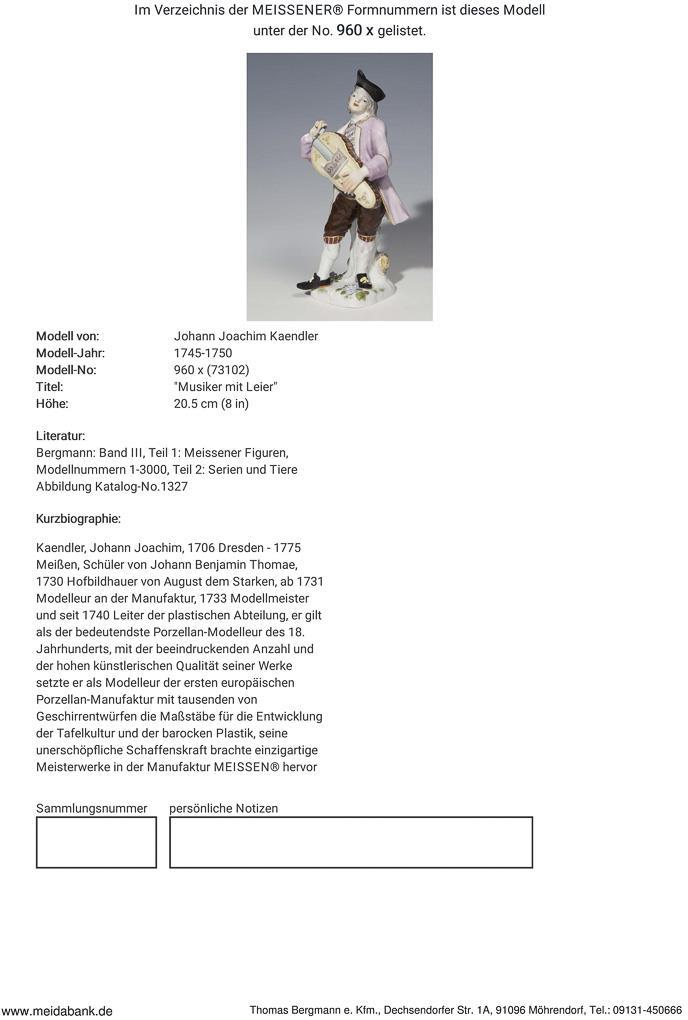 Kaendler, Hofbildhauer und Modelleur, seit 1731 an der Manufaktur, ab 1749 Leiter der plastischen Abteilung. Meissen-Manufaktur-Preis: 3527,- Euro * Partnerauktion Bergmann.