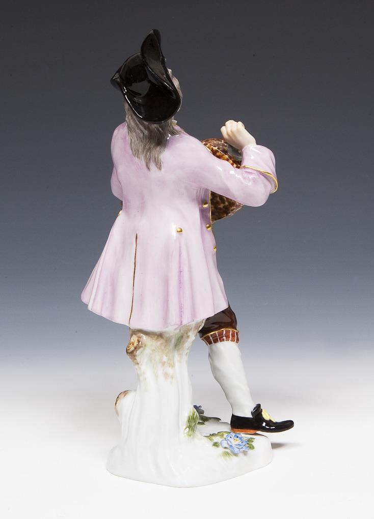 Modell von Johann Joachim Kaendler 1745-1750. Farbig bemalt, gold staffiert. Ritzmarke, Pressmarke, Schwertermarke mit Punkt, daneben einmal gestrichen. Hut, eine Hand, Blüten, ein Fuß, Leier und Sockelrand partiell restauriert.