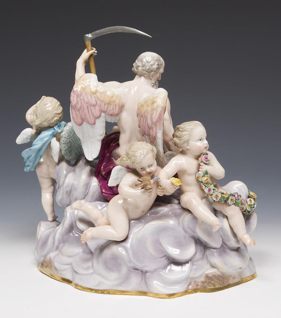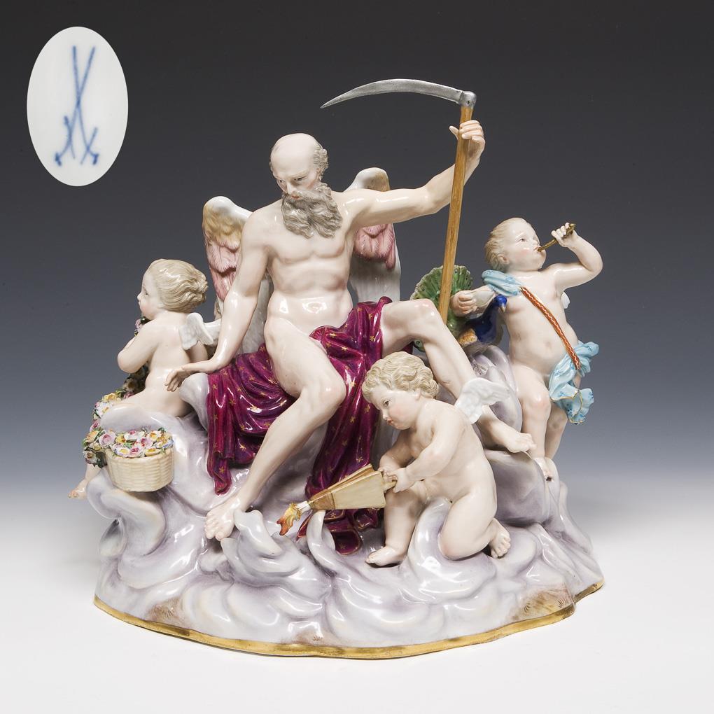 Modell von Michel Victor Acier 1777. Aus einer Serie von vier Elementen-Gruppen, farbig bemalt, gold staffiert. Ritzmarke, Pressmarke, Malermarke, Schwertermarke. Eine Sockelecke, wenige Blättchen, an Chronos ein Arm, eine Schulter, eine Hand, an Amoretten zwei Beine, Vogel, ein Arm mit Schale, Pfau, Flöte restauriert, Sichel ergänzt, Wolken brandrissig, wenige Blättchen, Sockelrand minimal bestoßen.