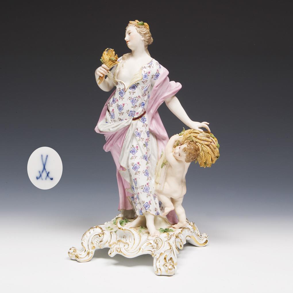 Modell von Johann Friedrich Eberlein 1745. Aus einer Serie von vier Jahreszeiten-Figuren, farbig bemalt, gold staffiert. Ritzmarke, Pressmarke, Malermarke, Schwertermarke. Ährenspitzen, Blättchen partiell restauriert, leicht bestoßen.