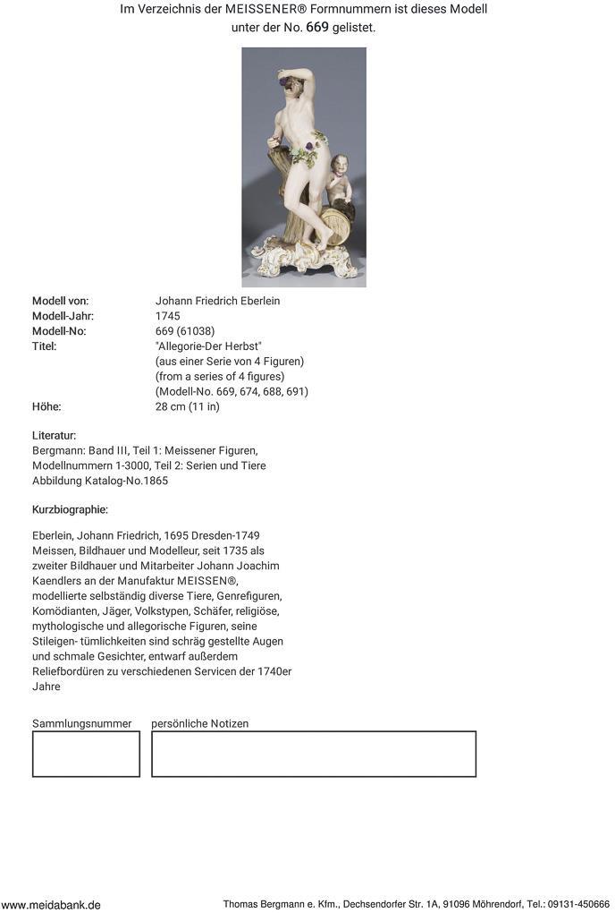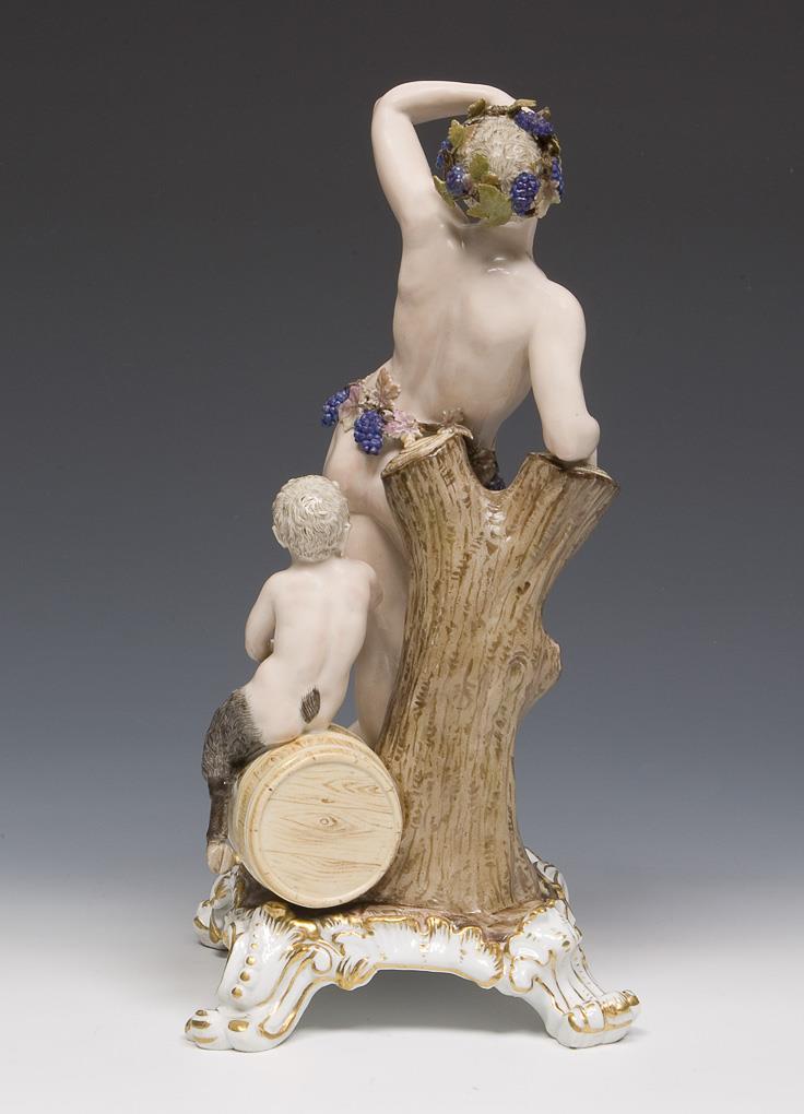 Modell von Johann Friedrich Eberlein 1745. Aus einer Serie von vier Jahreszeiten-Figuren, farbig bemalt, gold staffiert. Ritzmarke, Pressmarke, Malermarke, Schwertermarke. Einige Blätter, Trauben, ein Faunarm, Faunbeine, eine Hüfte restauriert, kleine Glasurdefekte, kleine Brandrisse am Sockel, an einem Fuß.