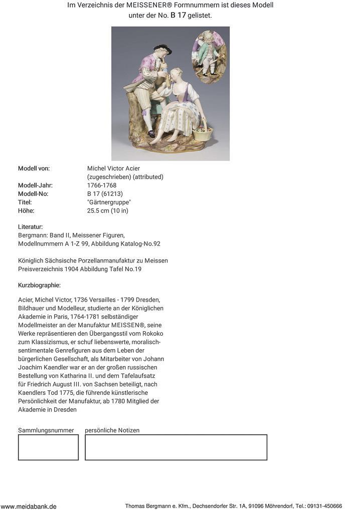 Acier, Bildhauer und Modelleur, studierte an der Akademie in Paris, 1764-1781 selbständiger Modellmeister in Meissen. Meissen-Manufaktur-Preis: 13500,- Euro * Partnerauktion Bergmann.