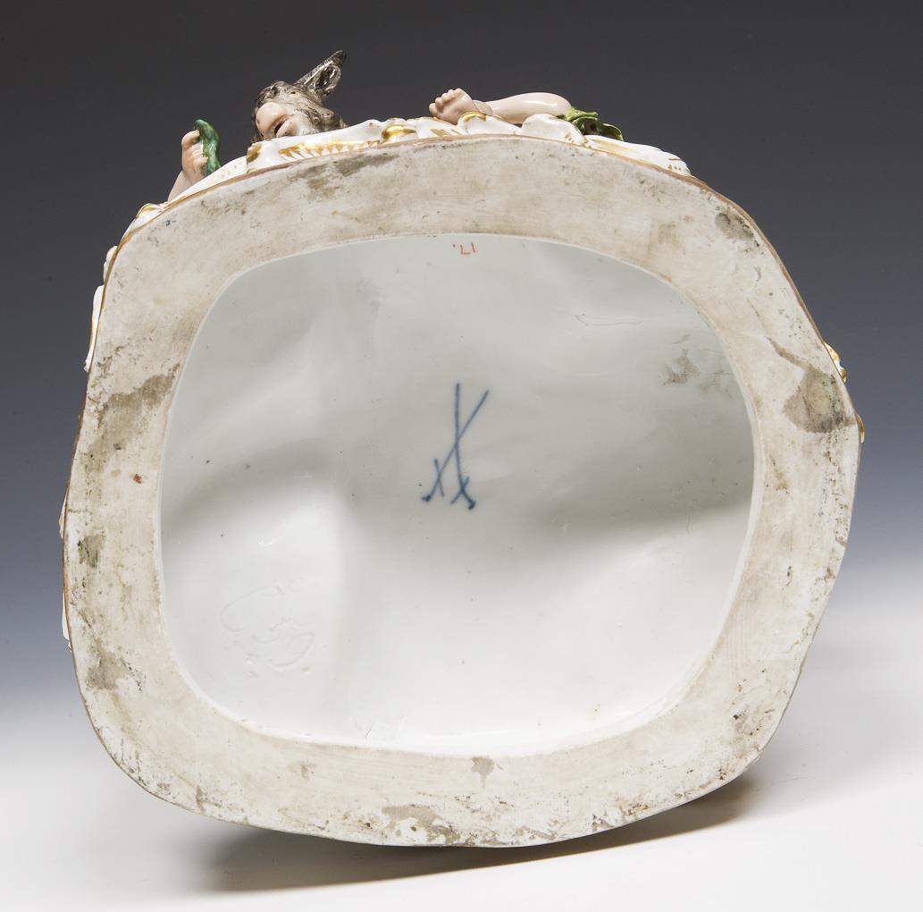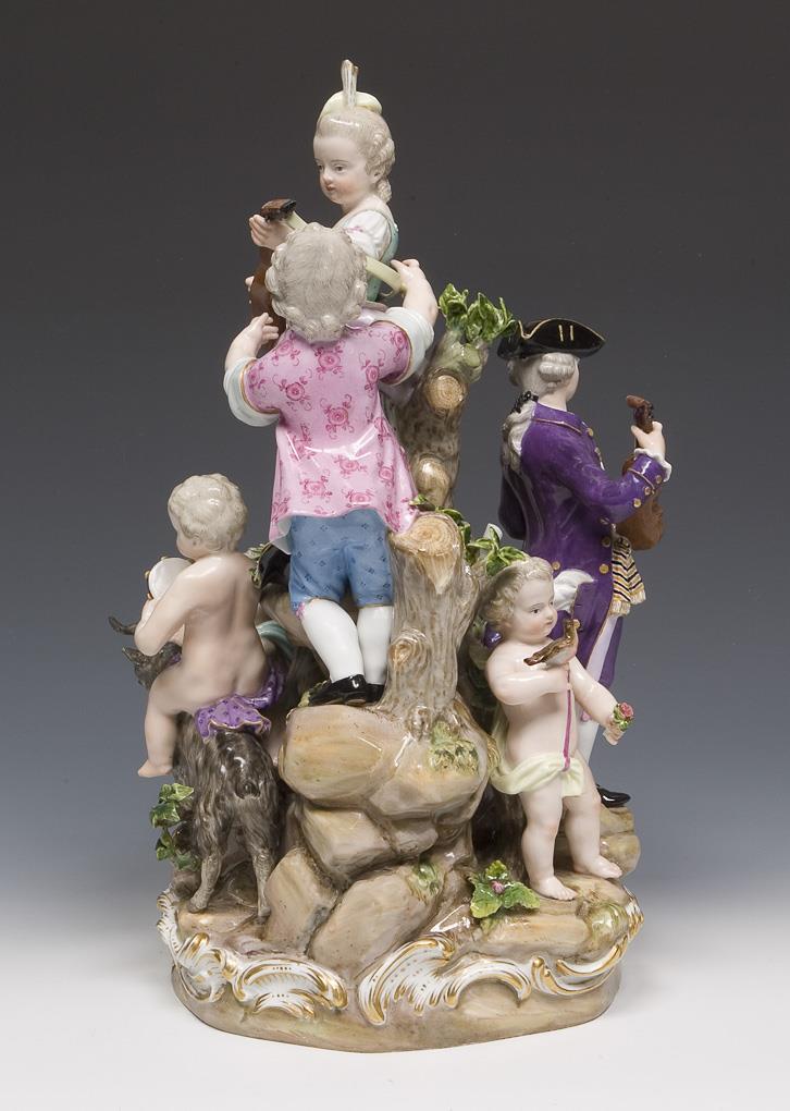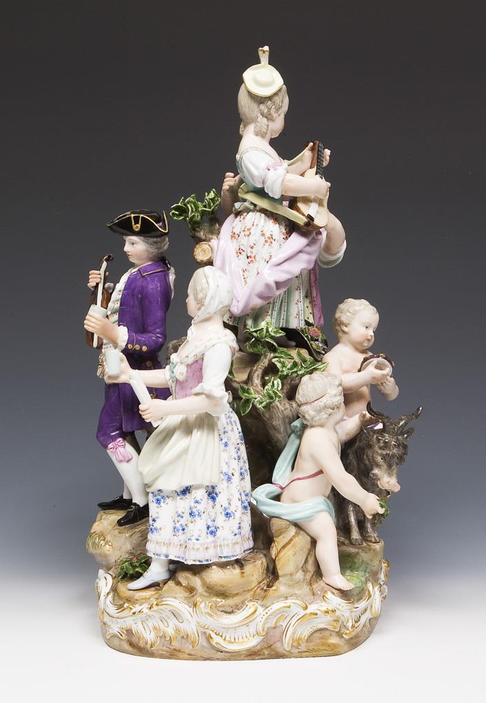 Modell von Michel Victor Acier 1768-1770. Farbig bemalt, gold staffiert. Ritzmarke, Malermarke, Schwertermarke. Gitarrensteg, Band, Blätter, drei Hände, zwei Becher, Geige, zwei Amoretten, Ziege, Hut mit Blüten, Sockelboden restauriert, im Felsen Glasurdefekte.