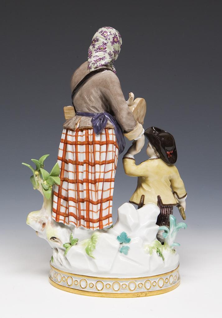 Modell von Carl August Starcke 1775-1779. Pendant zu Modell-Nr. F 38 x "Bettler mit Kind". Farbig bemalt, gold staffiert. Ritzmarke, Pressmarke, Malermarke, Schwertermarke. Ast und Blätter, Stab restauriert, ein Blatt bestoßen.