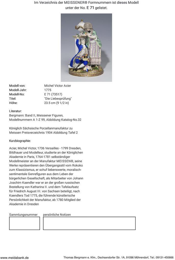 Acier, Bildhauer und Modelleur, studierte an der Akademie in Paris, 1764-1781 selbständiger Modellmeister in Meissen. Meissen-Manufaktur-Preis: 15000,- Euro * Partnerauktion Bergmann.