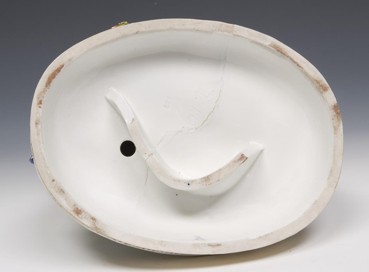Modell von Johann Carl Schönheit 1787. Pendant zu Modell-Nr. I 60 "Die Annäherung". Farbig bemalt, gold staffiert. Ritzmarke, Pressmarke, Malermarke, Schwertermarke einmal gestrichen. Blüten, Blätter, Henkel, drei Finger, Gürtelzipfel, Hutfedern, eine Hutschleife restauriert, Brandriss im Sockelboden, einige Blättchen, ein Finger bestoßen.
