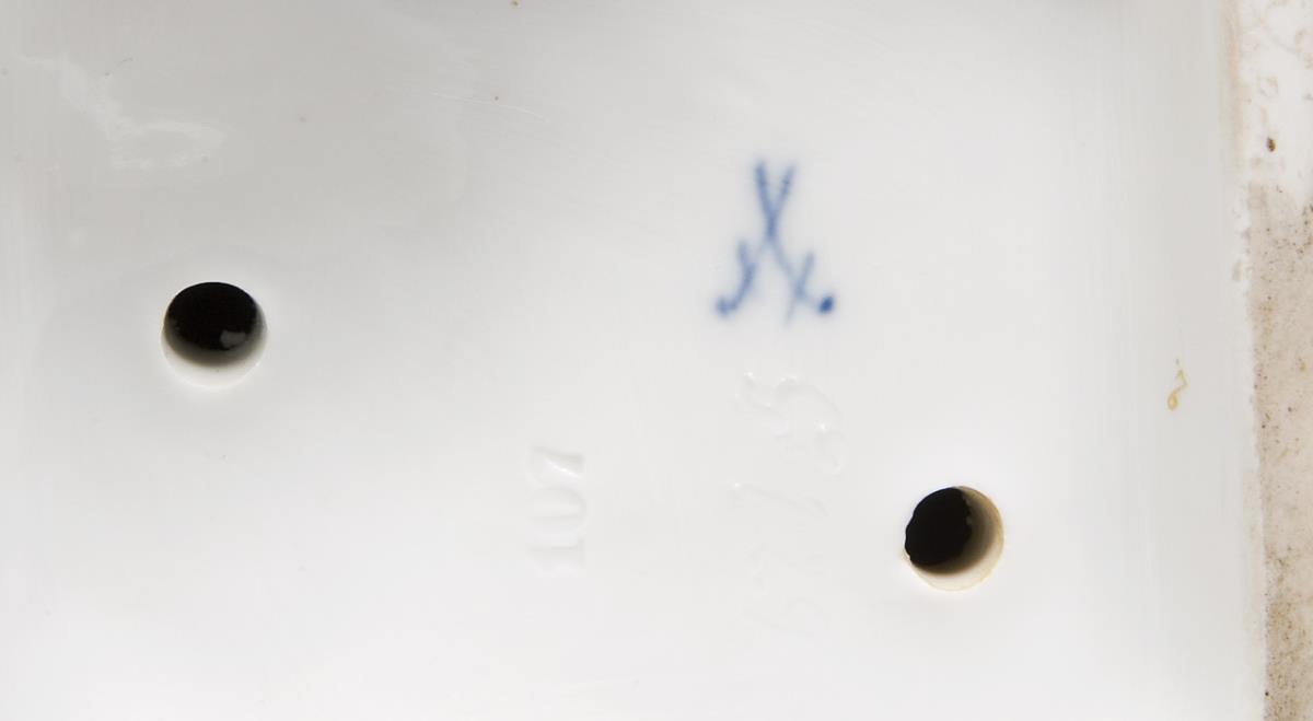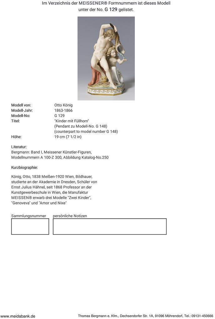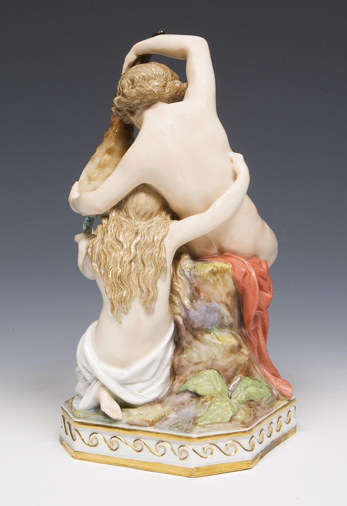 Modell von Otto König 1863-1866. Pendant zu Modell-Nr. G 148. Farbig bemalt, gold staffiert. Ritzmarke, Pressmarke, Malermarke, Schwertermarke. Füllhornspitze, eine Ecke am Unterarm, Sockelrand partiell restauriert.