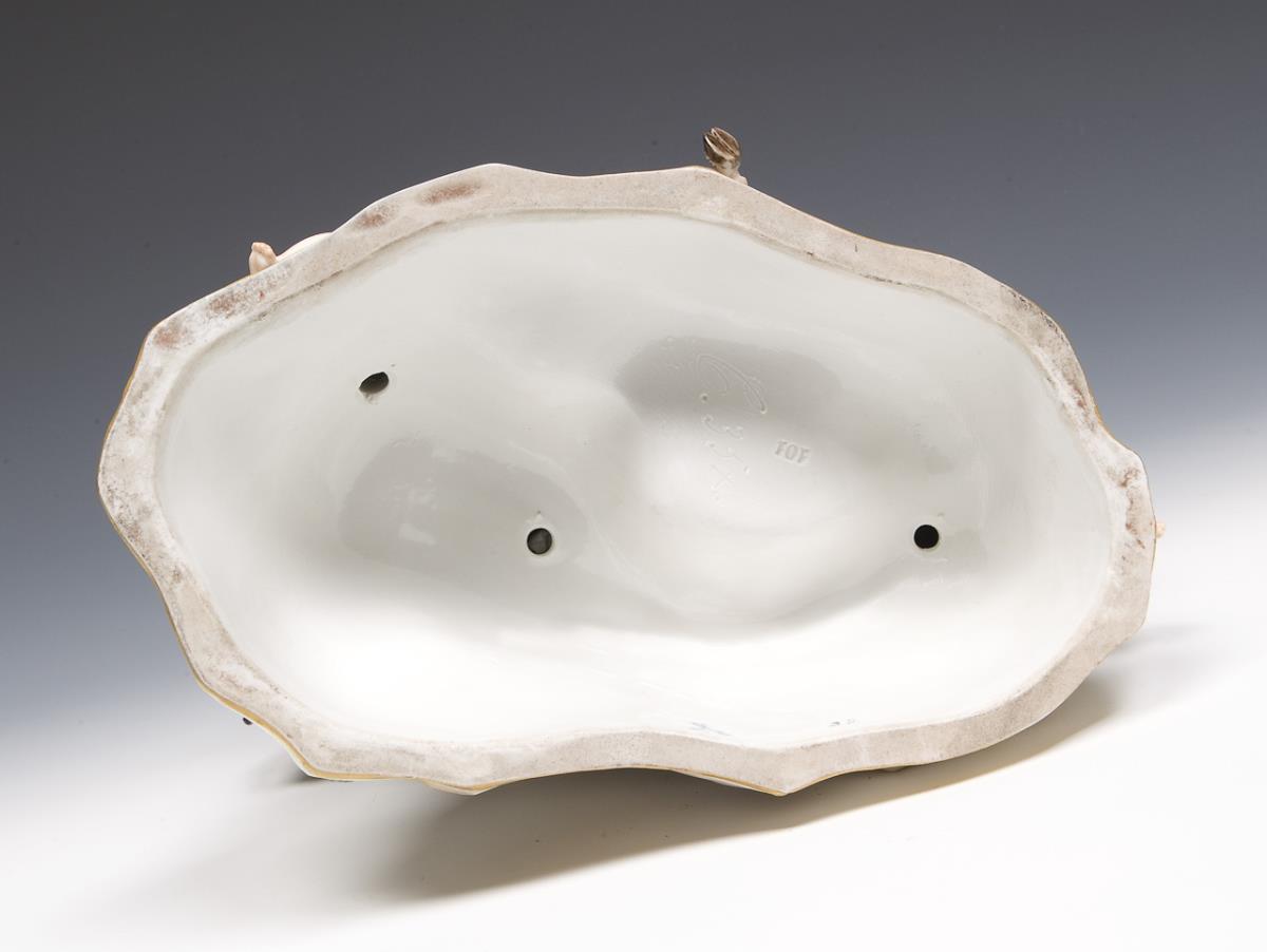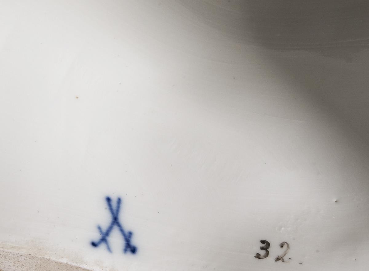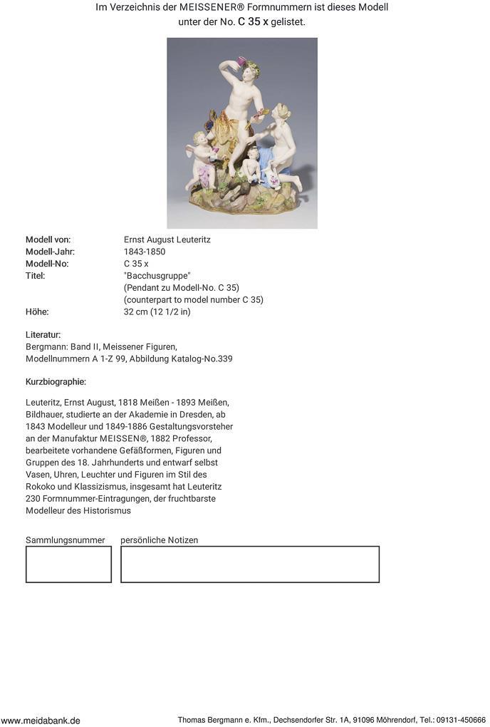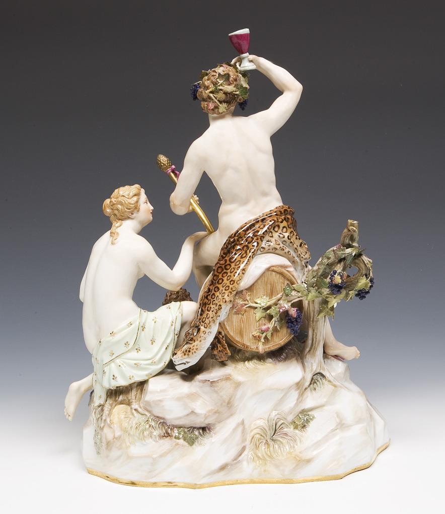Modell von Ernst August Leuteritz 1845-1850. Pendant zu Modell-Nr. C 35 "Tritonenfang". Farbig bemalt, gold staffiert, Ritzmarke, Pressmarke, Malermarke, Schwertermarke. Trauben, Blätter, Stabspitze mit Schleife, Köcherschlaufe restauriert, einige Blätter bestoßen, zwei minimale Brandrisse.