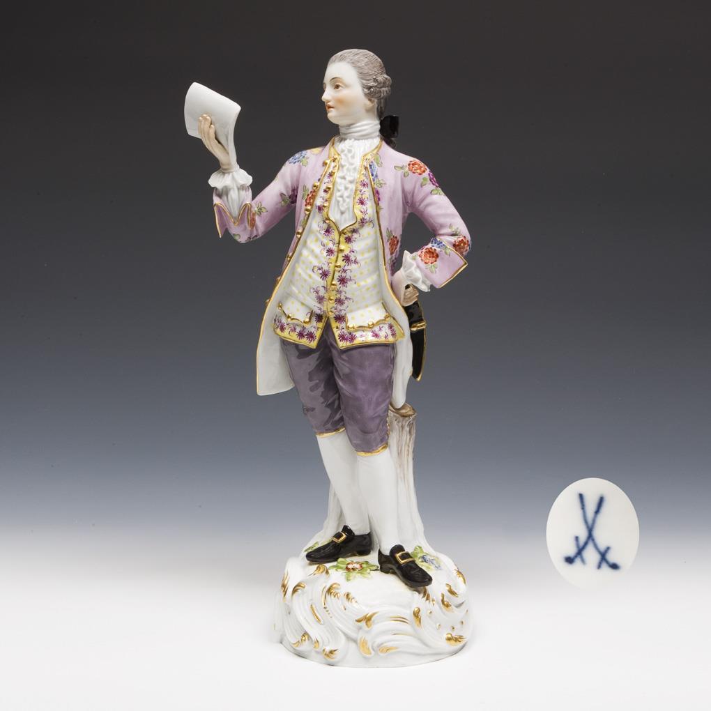 Modell von Rüdrich 1863-1866 (nach einem Modell von Friedrich Elias Meyer). Pendant zu Modell-Nr. G 105 "Sängerin". Farbig bemalt, gold staffiert. Ritzmarke, Pressmarke, Malermarke, Schwertermarke. Rückseitig zwei kleine Brandrisse.