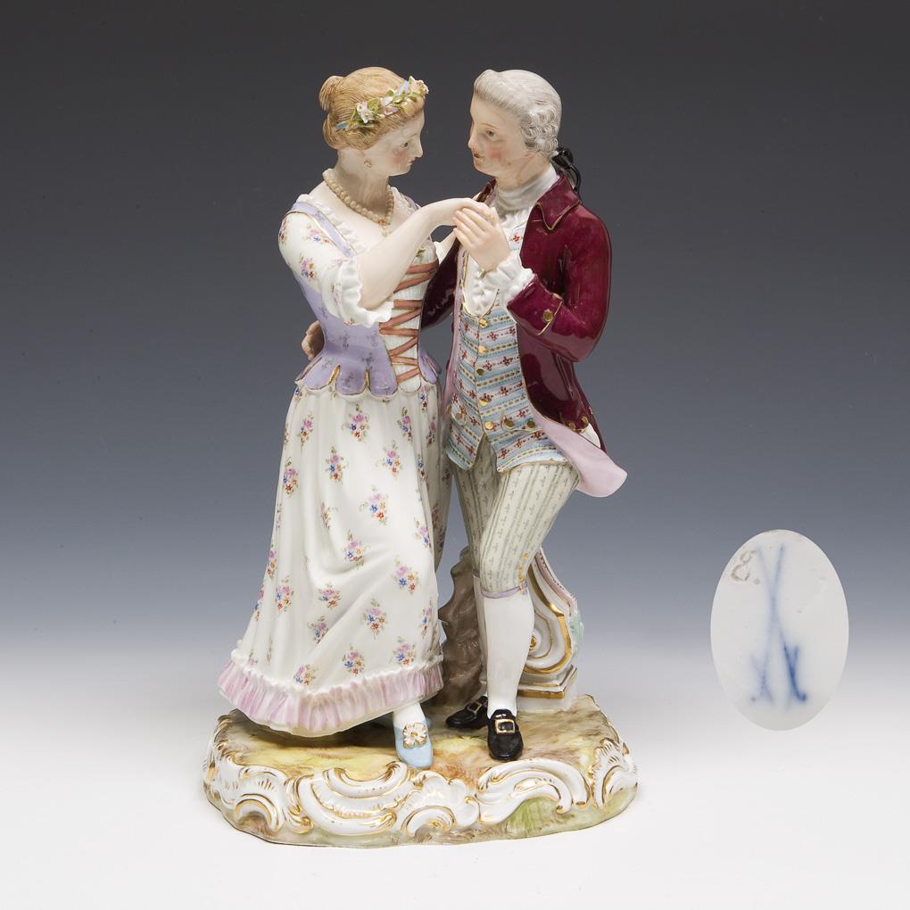 Modell von Ernst August Leuteritz 1882. Pendant zu Modell-Nr. N 104 "Brautpaar". Farbig bemalt, gold staffiert, Ritzmarke, Pressmarke, Malermarke, Schwertermarke. Rückseitig Haarschleife, Blüten restauriert, wenige Blättchen bestoßen.