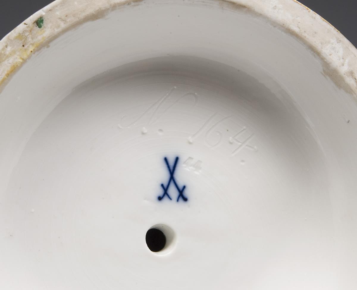 Modell von Johannes Daniel Schreitmüller 1885. Pendant zu Modell-Nr. N 165 "Sänger mit Laute". Farbig bemalt, gold staffiert. Ritzmarke, Pressmarke, Malermarke, Schwertermarke. Spitzenbesatz bestoßen, eine Hand, Schleife restauriert, im Sockel kleiner Brandriss.